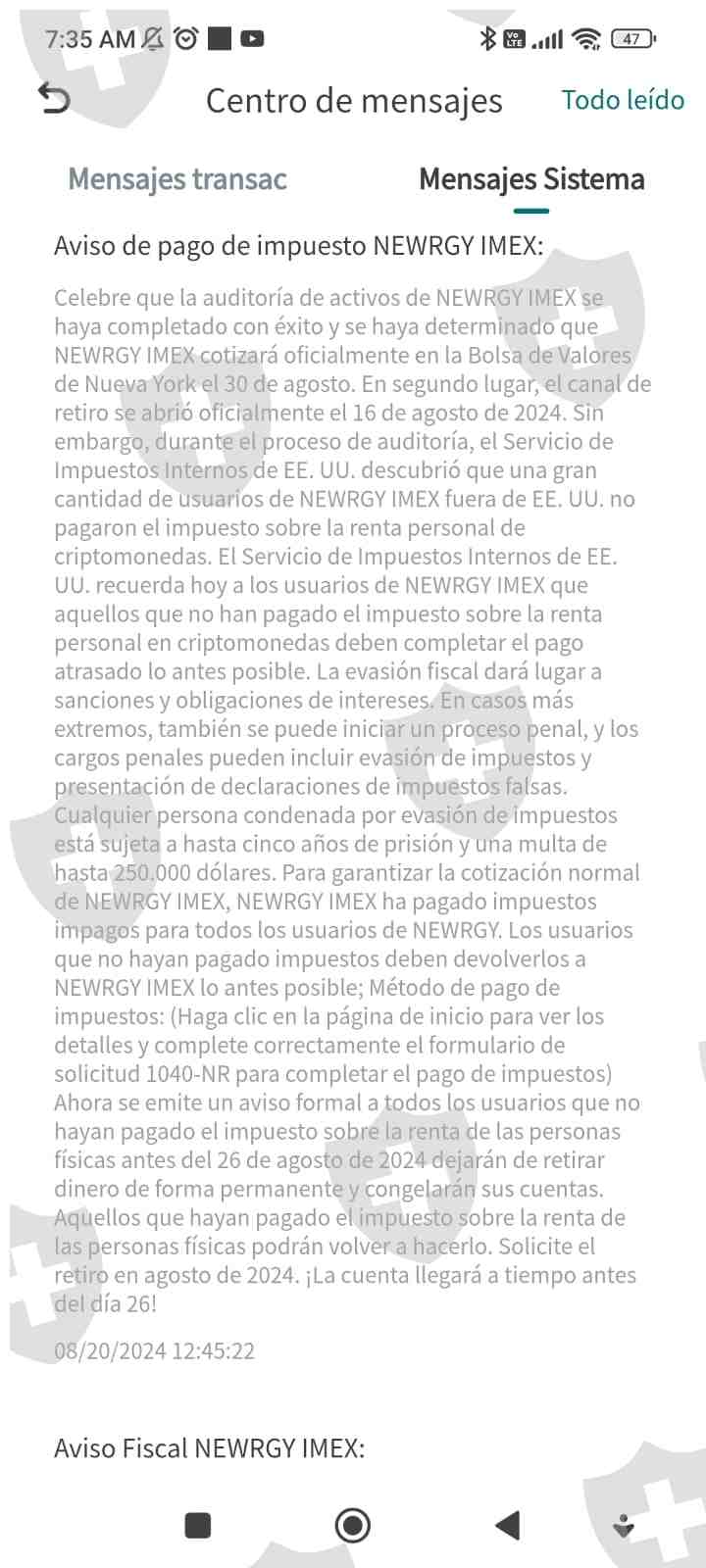 Newrgy imex , estaba todo normal hasta que el 8 de agosto bloquearon los retiros argumentando que estaban en una auditoria y se reabriria el canal de retiro el 16 de agosto. apartir de las 00:01 horas de ese dia, por lo que hice la solicitud de retiro y se veria reflejada para el lunes cosa, cosa que no sucedio y ese mismo dia se rechazo elretiro y lo regreso a mi wallet. mas tarde ese dia menciona la plataforma, que habia que pagar impuestos por haber operado en la plataforma. pero tendria que hacer aparte otro deposito para que me liberaran mis fondos ya que no me permitio retirar de los mios invertidos para pagarlos y que tenemos por tiempo hasta el 26 de agosto. de lo contrario bloquearan las cuentas. y se quedaran con mi inversion
