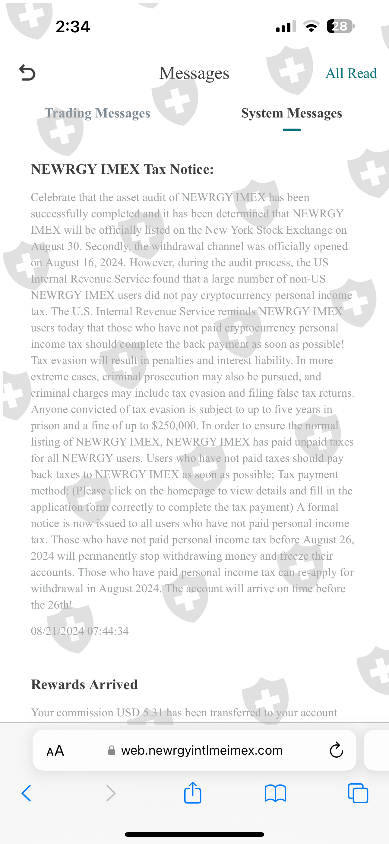 我在三月份通过一位值得信赖的朋友加入了这个投资计划;我们有一位名叫“Dany Lee”的中国迪斯科领导者,他每天向 WhatsApp 群组发送指令,并且是该群组的领导者。她创造并毁灭了必须的事物。有一天,他们突然关闭了提款,因为他们告诉我们,由于该公司将在纽约证券交易所上市,所以进行了磁盘审计,但我们不应该担心,它只持续了 10 天,周一,8月12日,他们开放提款;我提取了一大笔钱,这笔钱被退还给 NEWRGY IMEX因为我们必须缴纳账户总额的20%的税;我们的“领导”Dany Lee 威胁我们,如果我们不付款,他们将处以 25 万美元的罚款,并将把我们送回美国。所以现在我们不能撤回任何东西。当然,我不会支付任何费用,因为这完全是一个骗局。他们的客户服务是虚假的。帮我拿回我的钱。