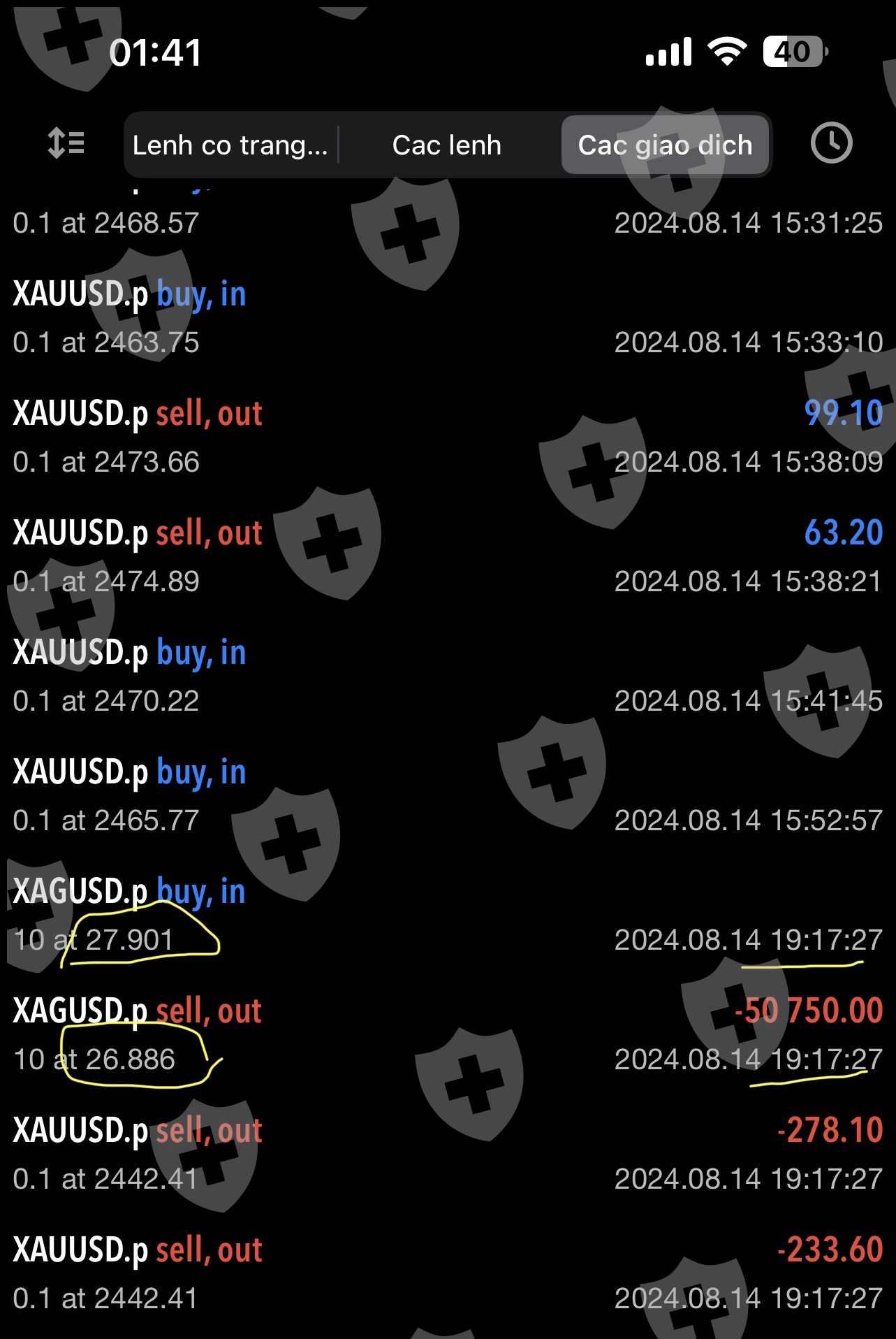 Tài khoản còn tiền nhưng đặt lệnh rút tiền từ 5/8/2024 không được, sàn treo lệnh rút tiền nhiều ngày, không cho rút, cũng không cho hủy lệnh rút tiền. gửi mail không có phản hồi. Sau đó, tối 14/8/2024 sàn tự nhồi lệnh buy 10 lot xagusd và sửa giá để cháy tài khoản khách hàng. lệnh vào/ra cùng thời điểm, và thời điểm đó xagusd không có giá giống giá vào hay ra như vậy