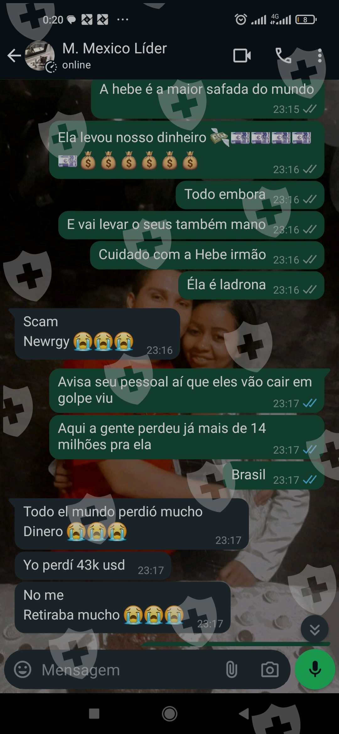 这 NEWRGY IMEX这是一个骗局,他们要收取20%的费用来提款,这又是他们的一个谎言,我们试图及时警告墨西哥的人们,但他们似乎不相信我们,不幸的是我丢了钱在那里,我为也在这里失败的人感到抱歉,她的名字叫Yu,在墨西哥她被称为Hebe Pura Farça,那么他们将不得不为他们对人们所做的一切付出代价。