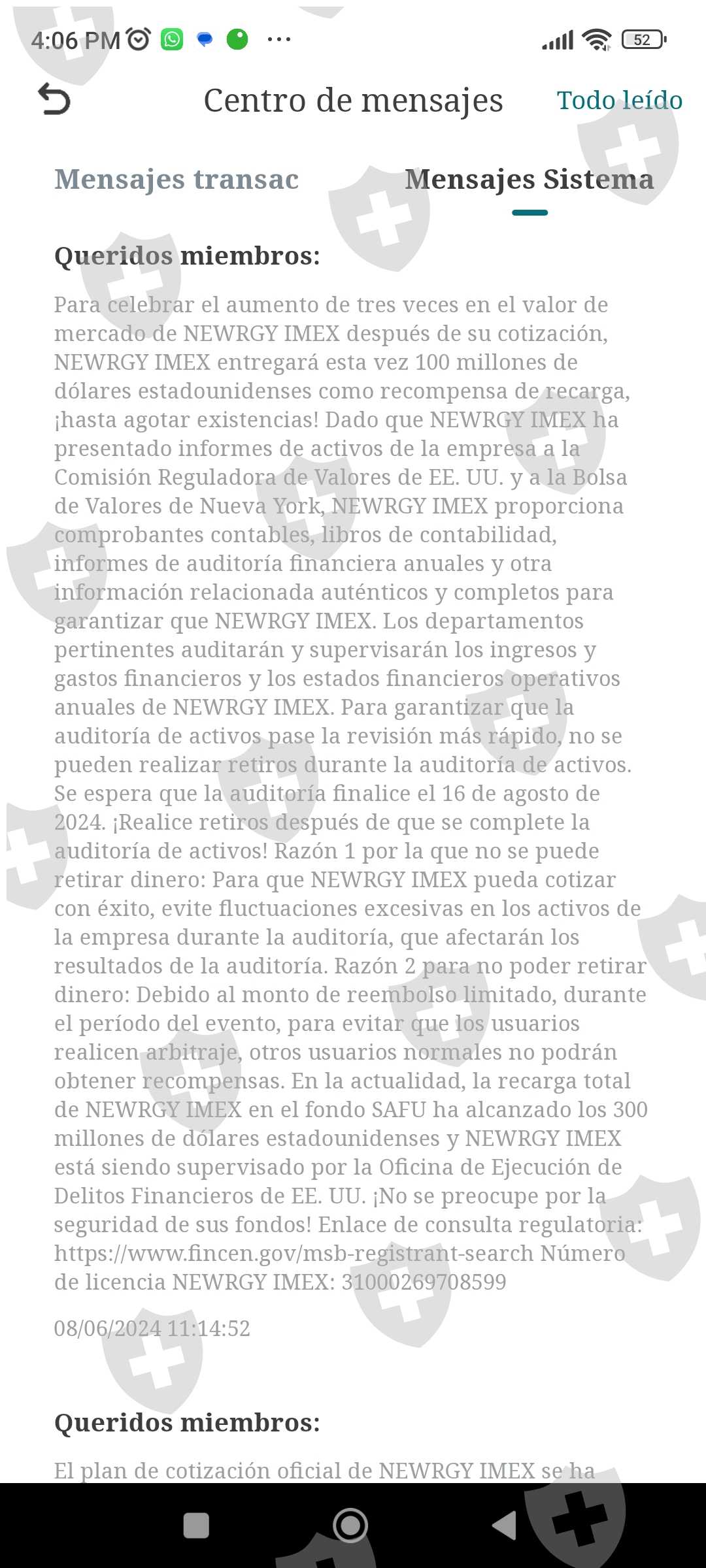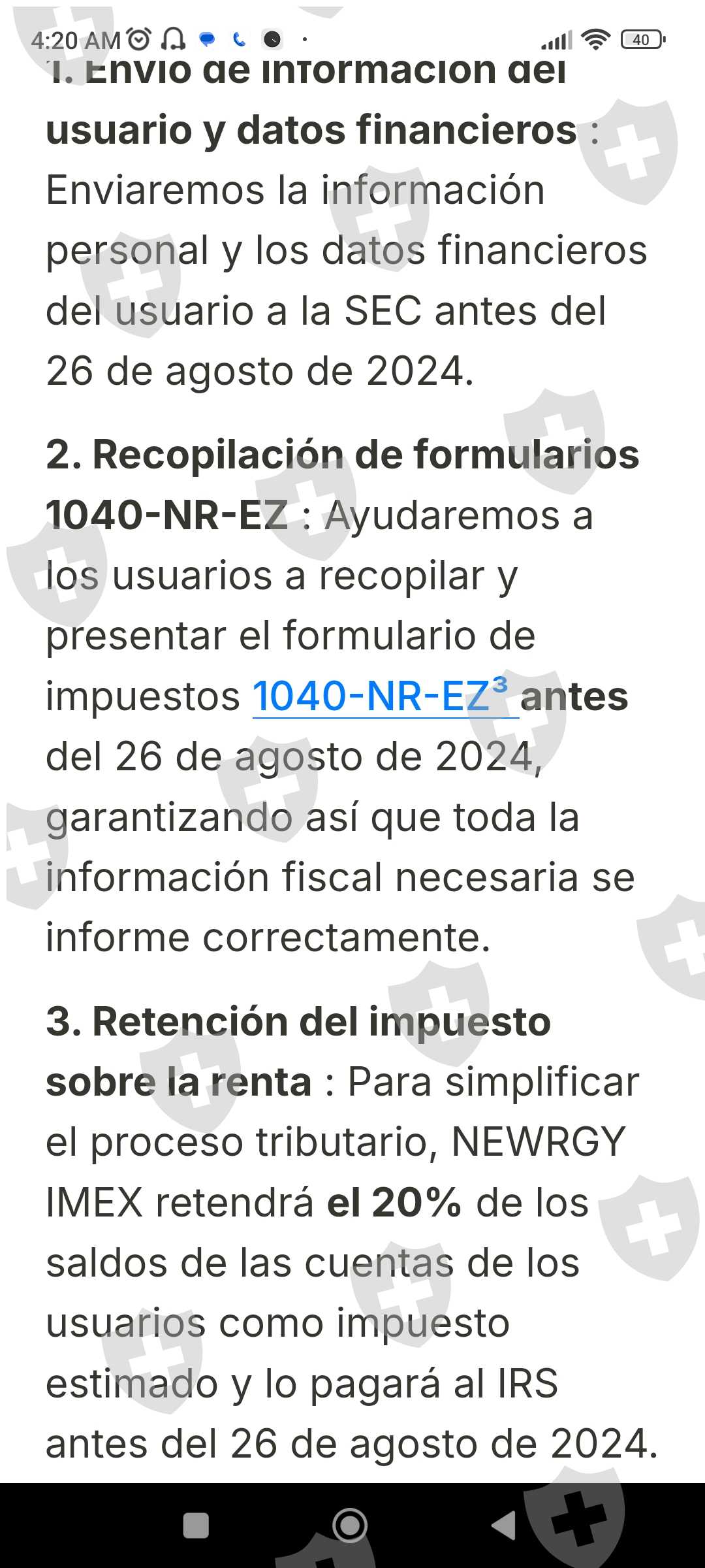 Newrgy a bloqueado los retiros de mi cuenta desde el 6 de agosto primero por una supuesta auditoría para poder cotizar en la bolsa de Estados Unidos EEUU la cual terminó el 16 de agosto y a partir de esa fecha continuaba bloqueada argumentando que según la auditoría resolvieron que hay que pagar el 20% de impuestos del ejercicio 2023-2024 pero lo importante es que solo tengo poco más de un mes que me registre y me están cobrando el 20% de mis propios depósitos
