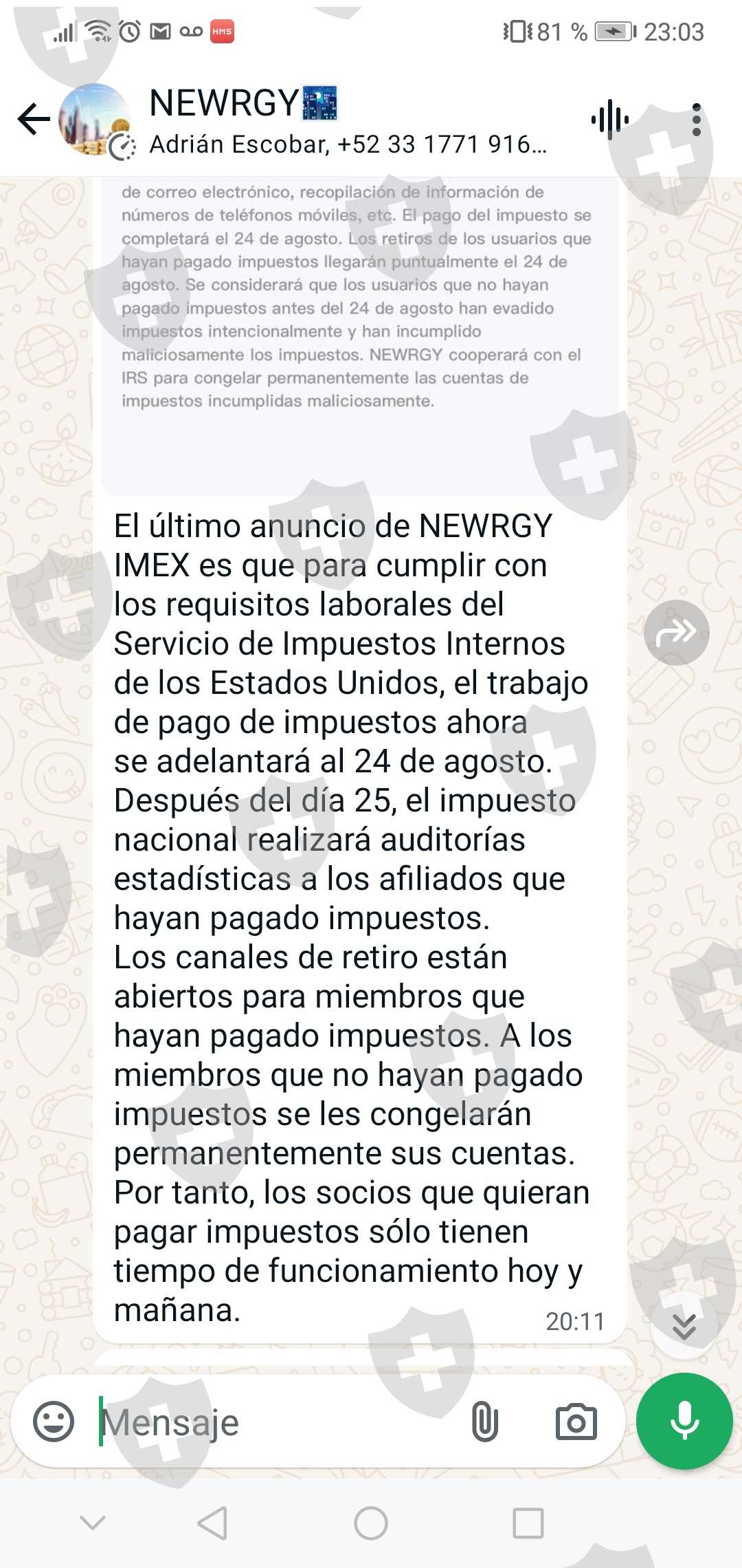 Pidiendo que deposite 539.86 dólares para poder retirar mi dinero ya que me bloquearon los retiros de los fondos hasta que esté pago se realice. En dado caso de no hacerlo hasta el día 24 de agosto la cuenta se congelará y se dará de baja como sin dueño .. ayúdeme porfavor a recuerperar Mi inversión