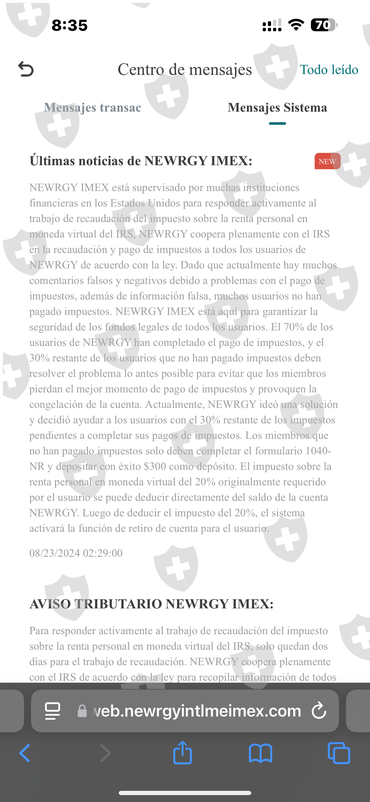 En vista de que nadie esta haciendo los oagos supuestos de impuestos, ahora solicitan solo el pago de $300 dolares acambio de que tomen del saldo disponible el 20% del supuesto impuesto para liberar los fondos. Evidentemente eso no sucedera, estan mencionando que hay mucha informacion falsa de lonsucedio y que Newrgy esta cooperando activamente con el gobierno de Usa para ese pago de impuestos.