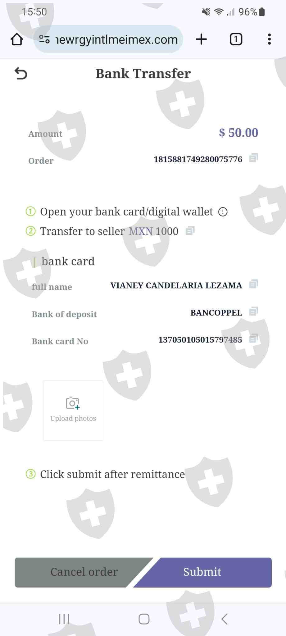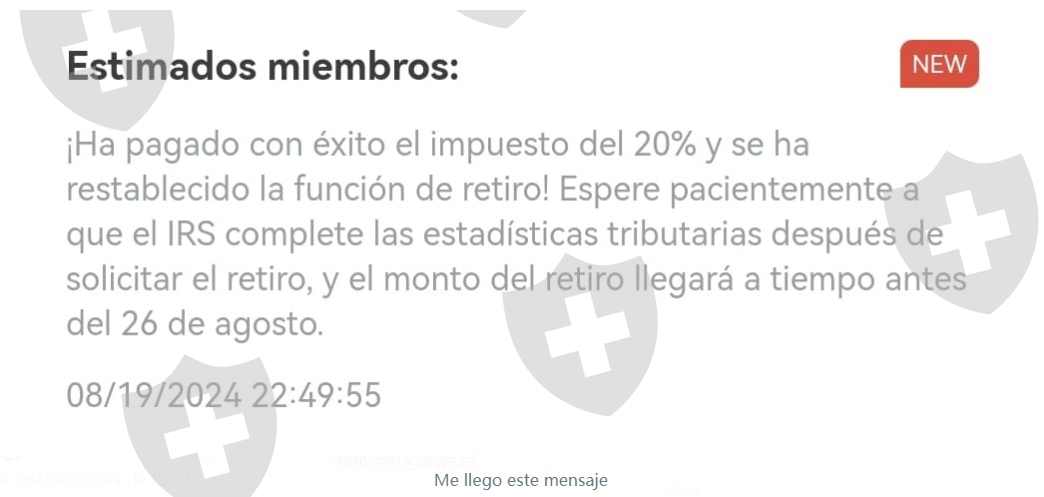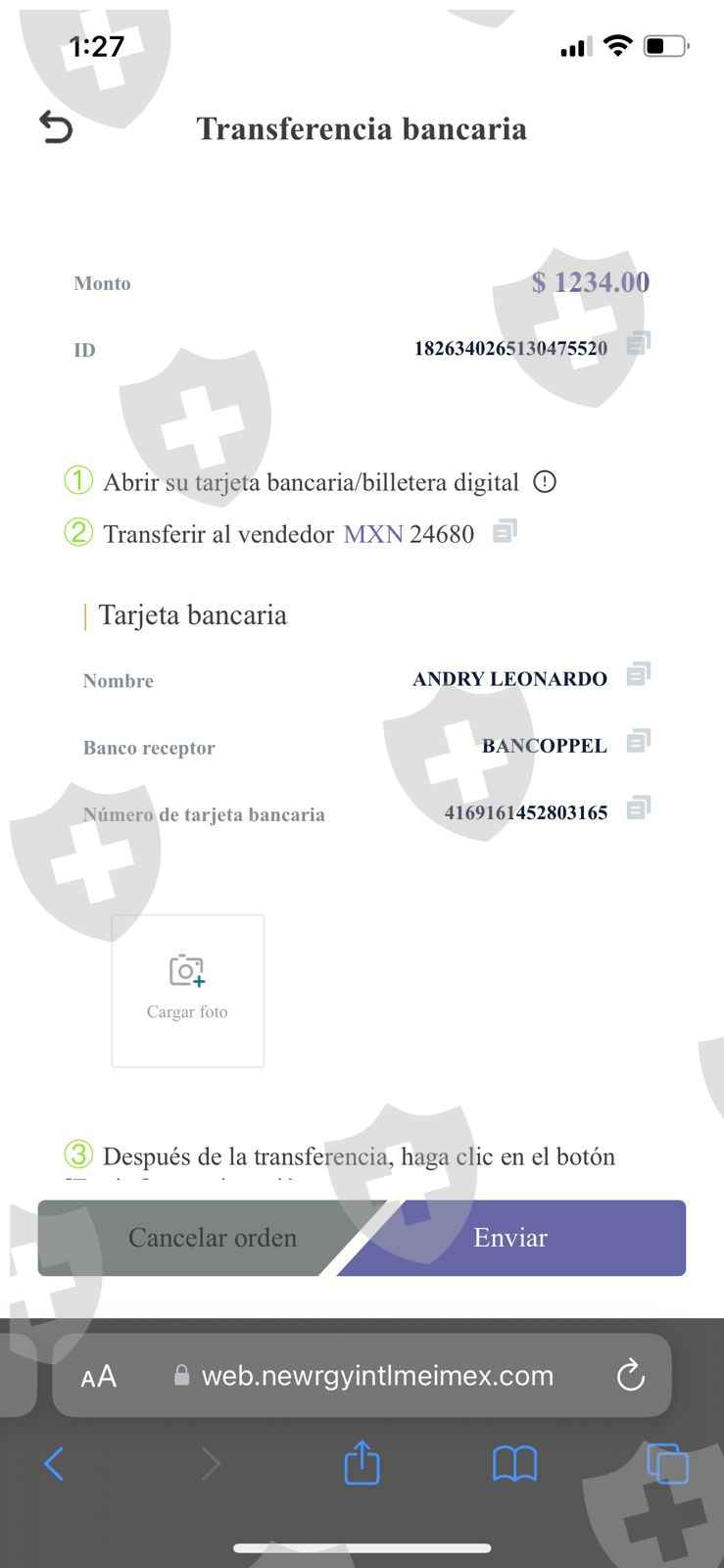 我受邀投资该平台 NEWRGY IMEX今天,当我想提款时,它不让我,因为我必须先缴纳20%的税。当我想付款时,Bancoppel银行中出现了几个不同名称的帐户。这些账户与窃贼有关联。我唯一想要的就是他们支持我和其他300名被骗的人,我们只要求我们的资金,而不是他们承诺的所有钱。我投资了6000单位,我有所有存款证明。我们需要帮助🙏🏻