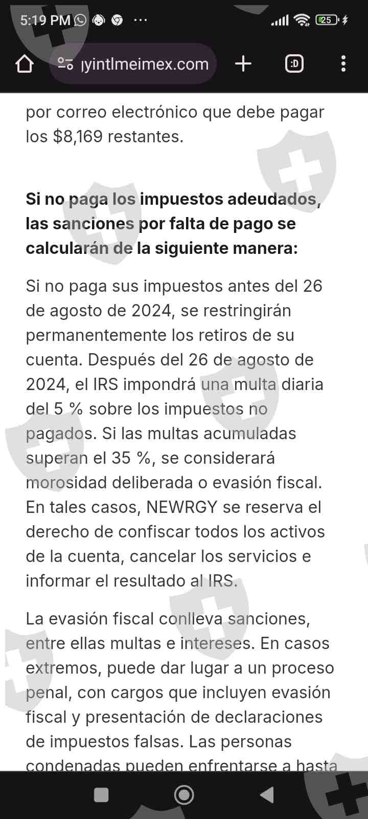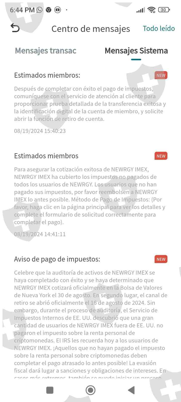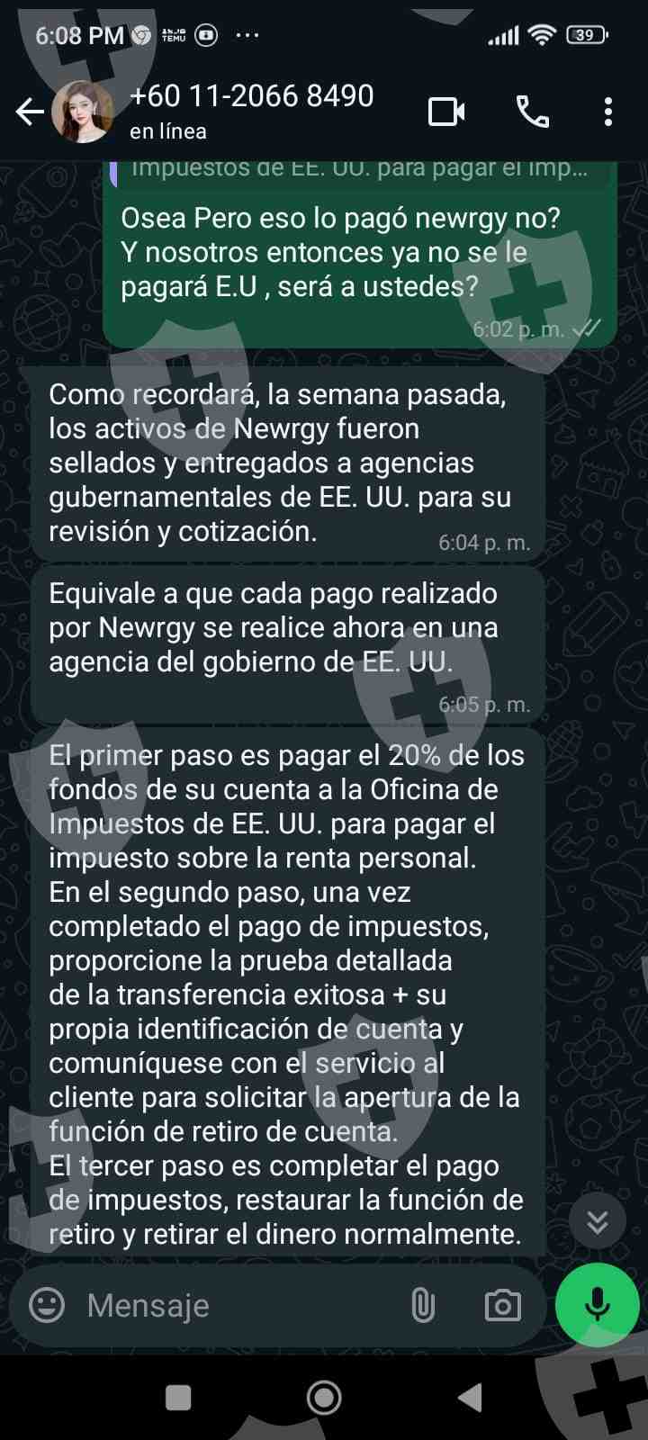 欺骗人们 NEWRGY IMEX,他们让很多人存钱,说要给双倍的钱,然后由于涉嫌审计,钱无法提取,他们说审计很顺利,但我们必须存20%的税才能继续我们的账户,因为根据“如果你不付款,账户将被冻结”,那些付款的人收到了错误的提款日期,他们说最后一次提款将在 8 月 24 日 11:50 之前到达,以及 12 点之后: 00am 应用程序不再工作,页面无法打开。