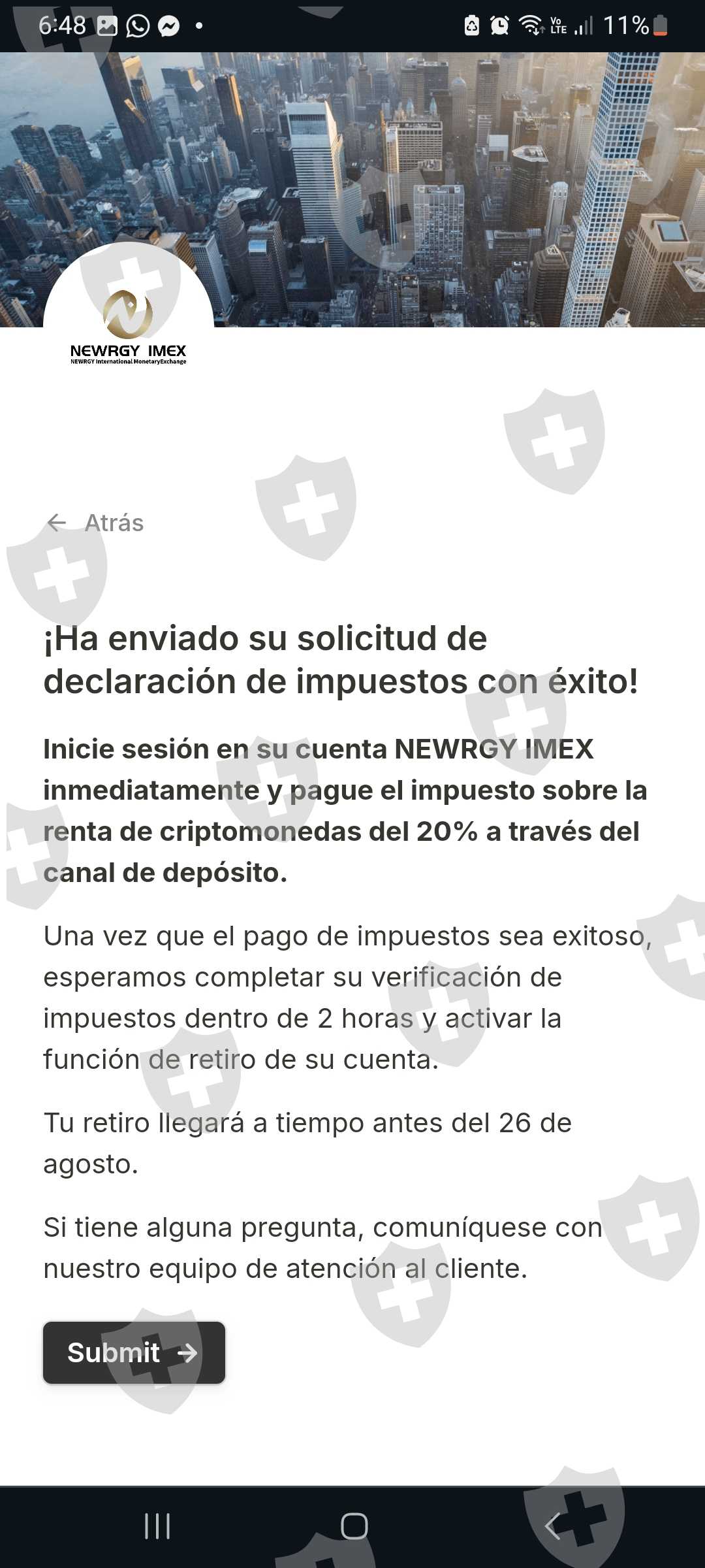 Hice mi deposito del 20% del supuesto impuesto, puede hacer mi retiro, pero es fecha y hora de que no lo he recibido en OKX. Solo quiero recuperar algo de lo que invertí, uno inicia en esto pensando en poder ayudarnos económicamente y no es justo que nos engañen de esa manera 🥲.