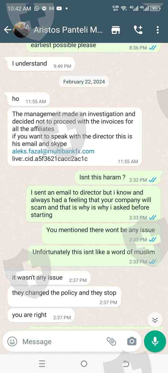 Hello, I am writting to report the scam by multibankfx, I was working as affiliate with the company, and company was supposed to pay my commission of USD 4200 in the month of Feb-2024 but company has terminated the contract without any email