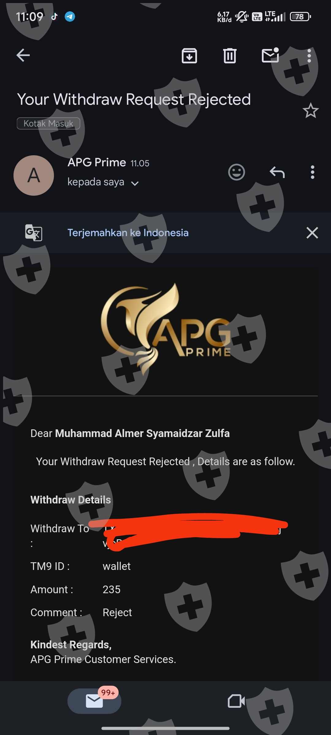 等待±2周后提现被拒绝,然后账户突然被禁止,无法重新登录账户