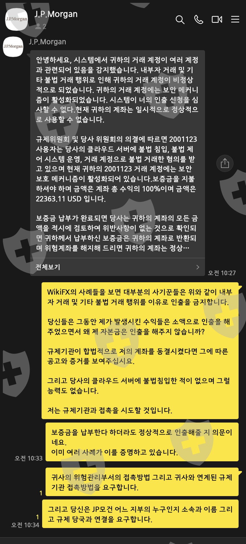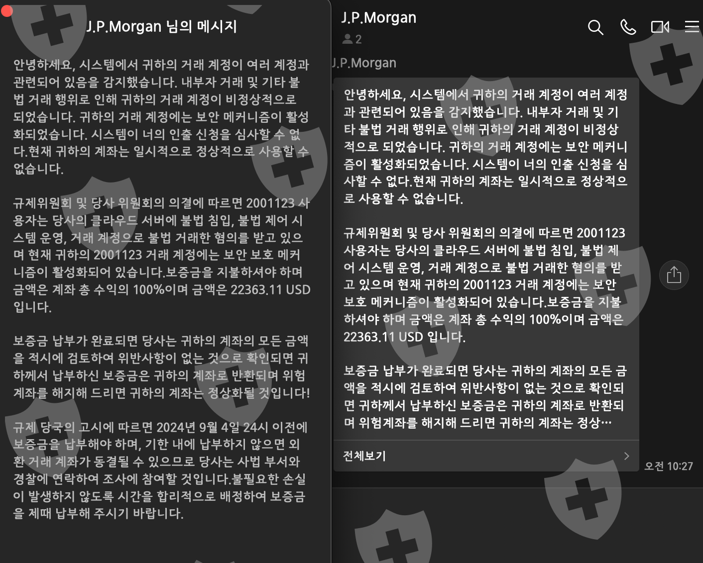 저는 카카오톡으로 대화를 진행했고, 사례와 동일한 방법으로 당한걸(미국의 삼촌 이야기) 인지해 J.P.Morgan 사이트를 통해 출금 요청중입니다.
