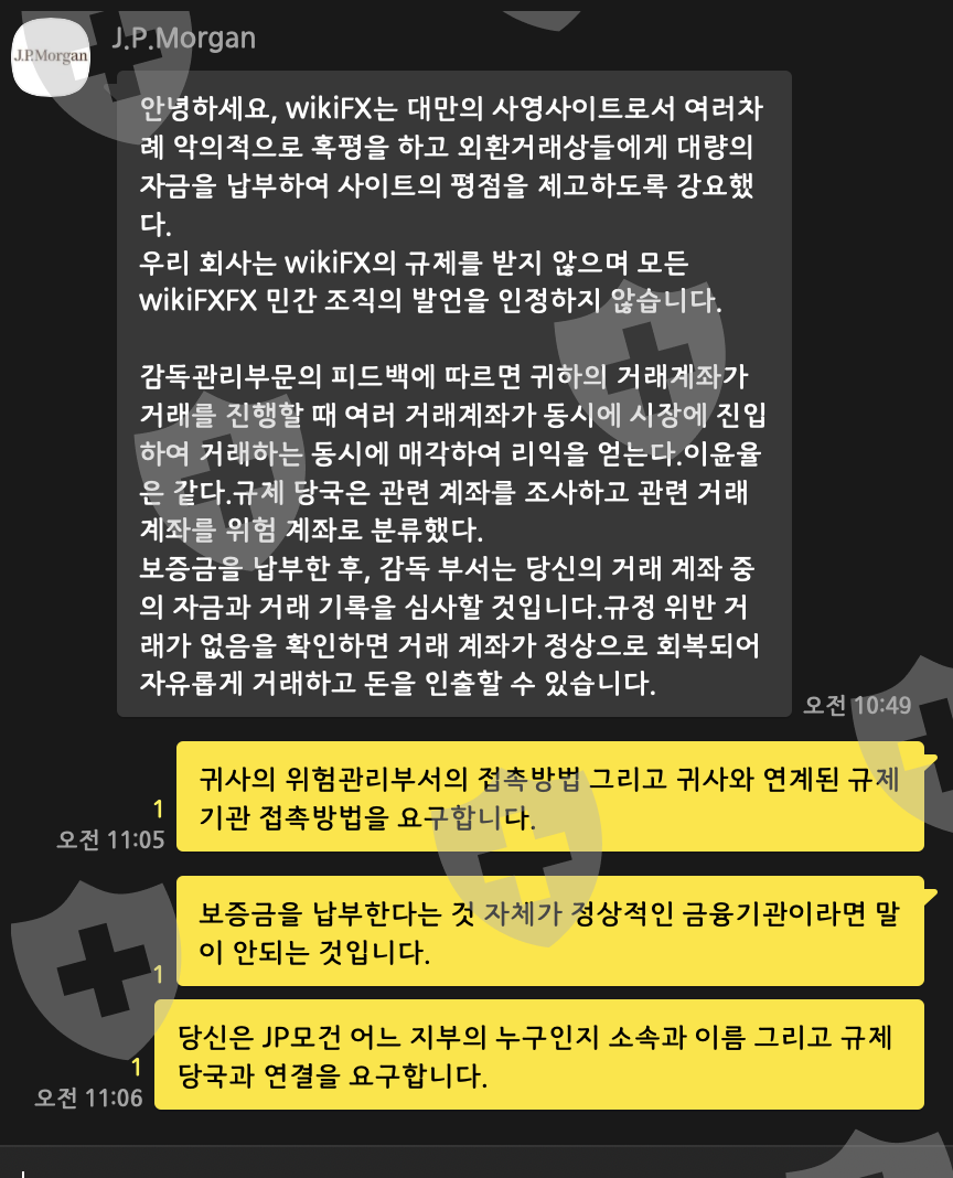 前夕 DEUS我看到了一些关于浪漫邮票骗局的信息。我通过KakaoTalk进行了交谈,我意识到我和案件(美国叔叔的故事)一样受害,所以我通过摩根大通网站请求退出。 “系统检测到您的交易账户关联多个账户,存在内幕交易等非法交易行为,导致您的交易账户出现异常。”为此,他们拒绝取款并要求你支付押金。它要求 22363.11 美元,但我想至少找到我存入的本金。另外,我提到了wikifx的例子,我收到的回复如下。 “您好,wikifx是一家台湾私人网站,多次受到批评并迫使外汇交易者支付大量资金以提高网站评级。我们公司不受wikifx监管,隶属于所有wikifxfx私人组织。根据反馈监管部门表示,当您的交易账户进行交易时,多个交易账户同时进场并同时卖出获利,经调查并将相关交易账户归类为同一交易账户。风险账户并缴纳保证金后,监管部门将检查您的交易账户内的资金和交易记录,确认无违规行为后,交易账户将恢复正常,您可以自由交易和提款。目前没有进行提现,整个过程已被抓拍。所有的钱都是为了偿还因生意失败而产生的债务。如果我失去了这笔钱,我就没有办法生活了。请帮忙。此外,我们可以回应有关该流程的记录和材料的请求。