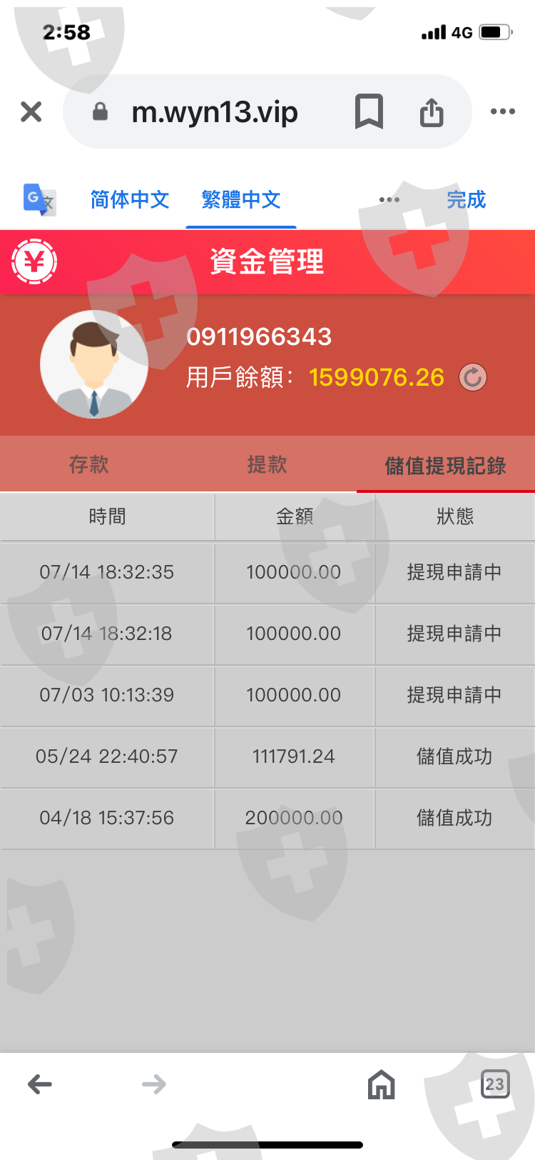 看到網路有這個平台可以賺錢,我就下載,客服也提供網路匯款,我匯款了,要提領錢時,都在審核中,我一共提領三次,三次提領10萬台幣,可是都未收到款,我問客服很多次,客服遲遲不回應,當我再次上這平台,發現我提領的錢,都不見了,原本一百九十多萬,卻變成一百五十多萬,這分明就是詐騙我的錢