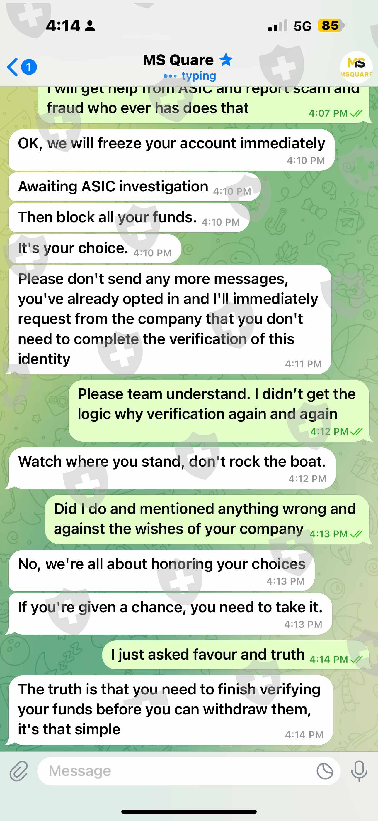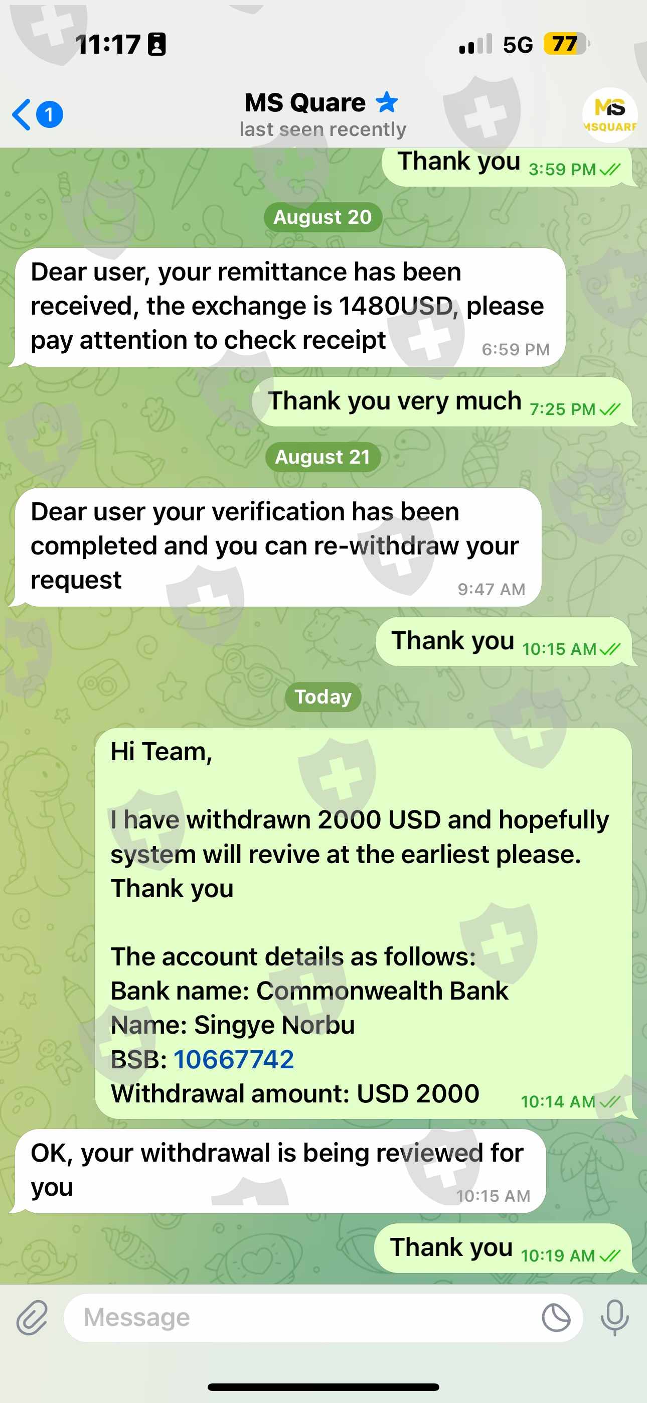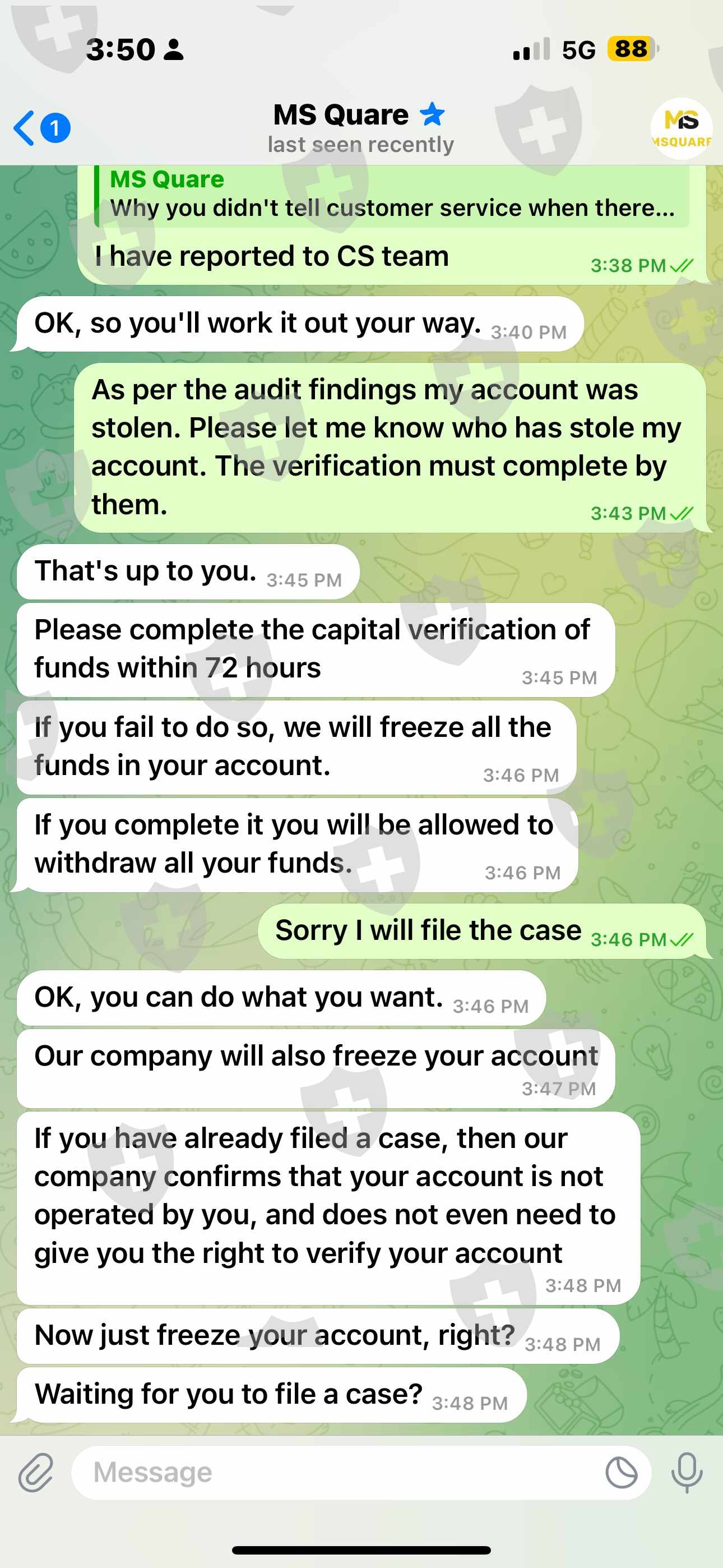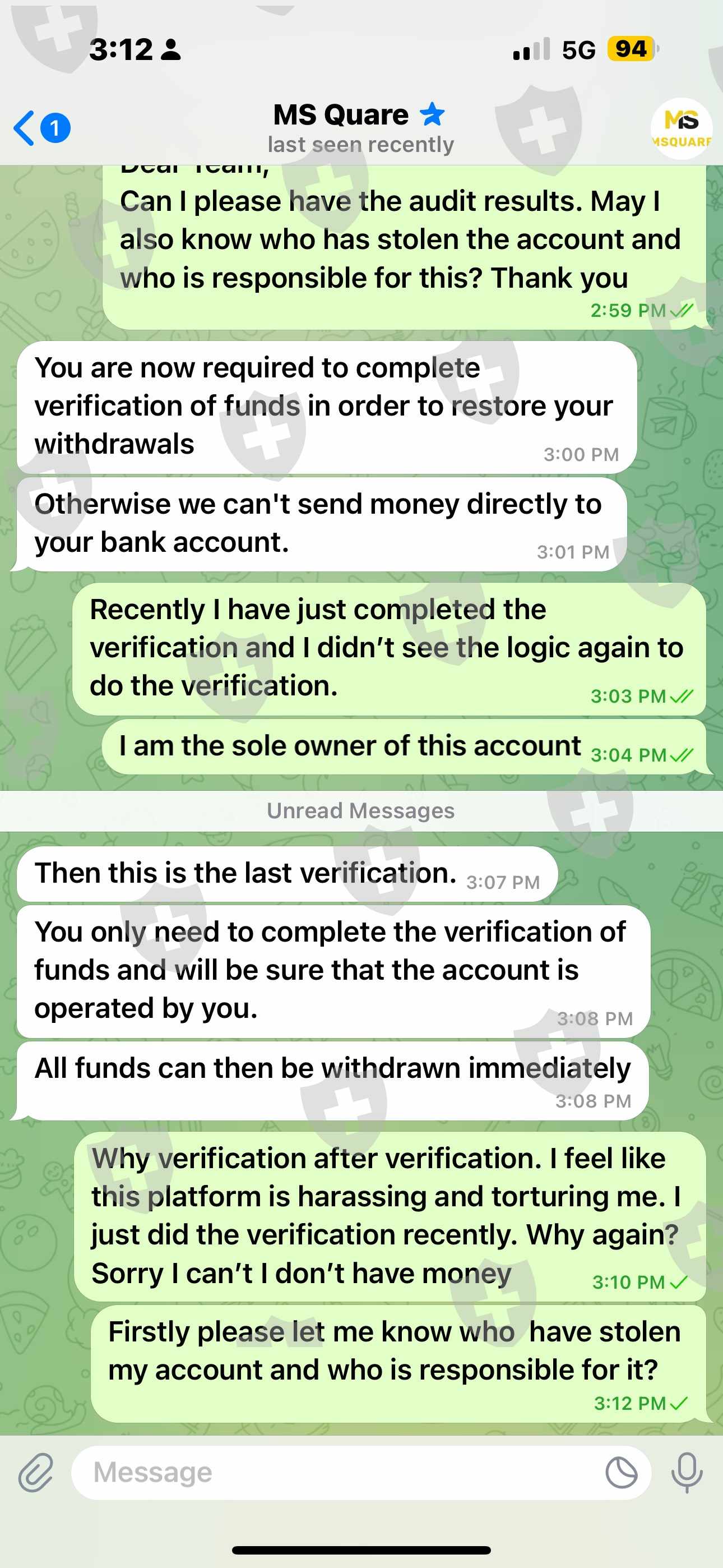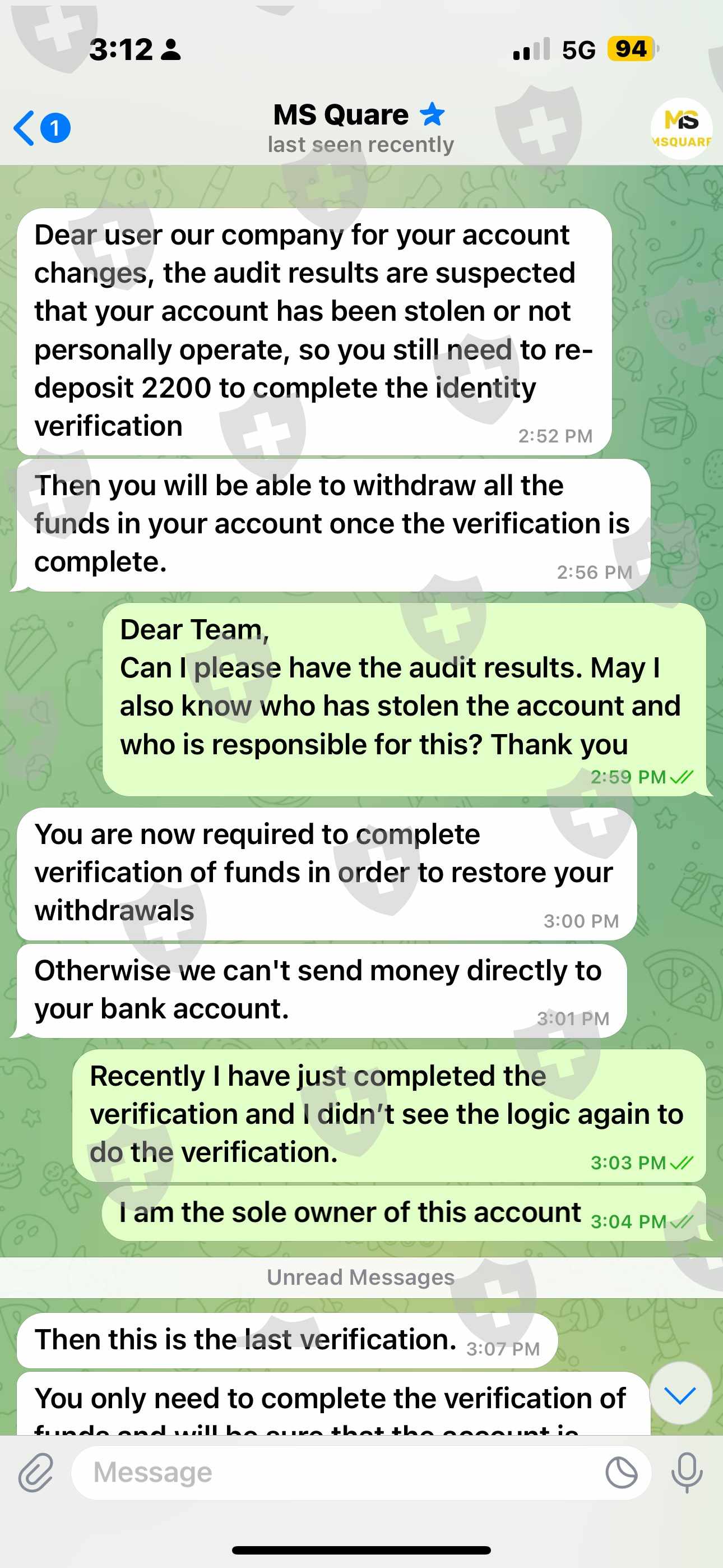 我加入了 MSquare最近我加入了该小组,我存款 4 次,到目前为止只提现了 100 美元。第三次存款后,我提现了 1000 美元,客服通知我提现正在审核中。后来我被要求存入总资金的 30% 以完成一次验证,因为我的账户被识别为机器人账户,之后我就可以正常提现了。我按照建议存款和验证。几天后,我再次发起 2000 美元的提现,同样的事情发生了。我再次被要求存入资金并完成验证才能正常提现。该小组表示,根据审计结果,我的账户被盗了,操作不当。我要求在线客服团队向我发送审计报告,谁偷了我的账户,但他们没有发给我。我甚至给公司管理层发了邮件,要求他们解决问题,但从来没有发生过。我不明白为什么我需要一次又一次地验证和存入资金