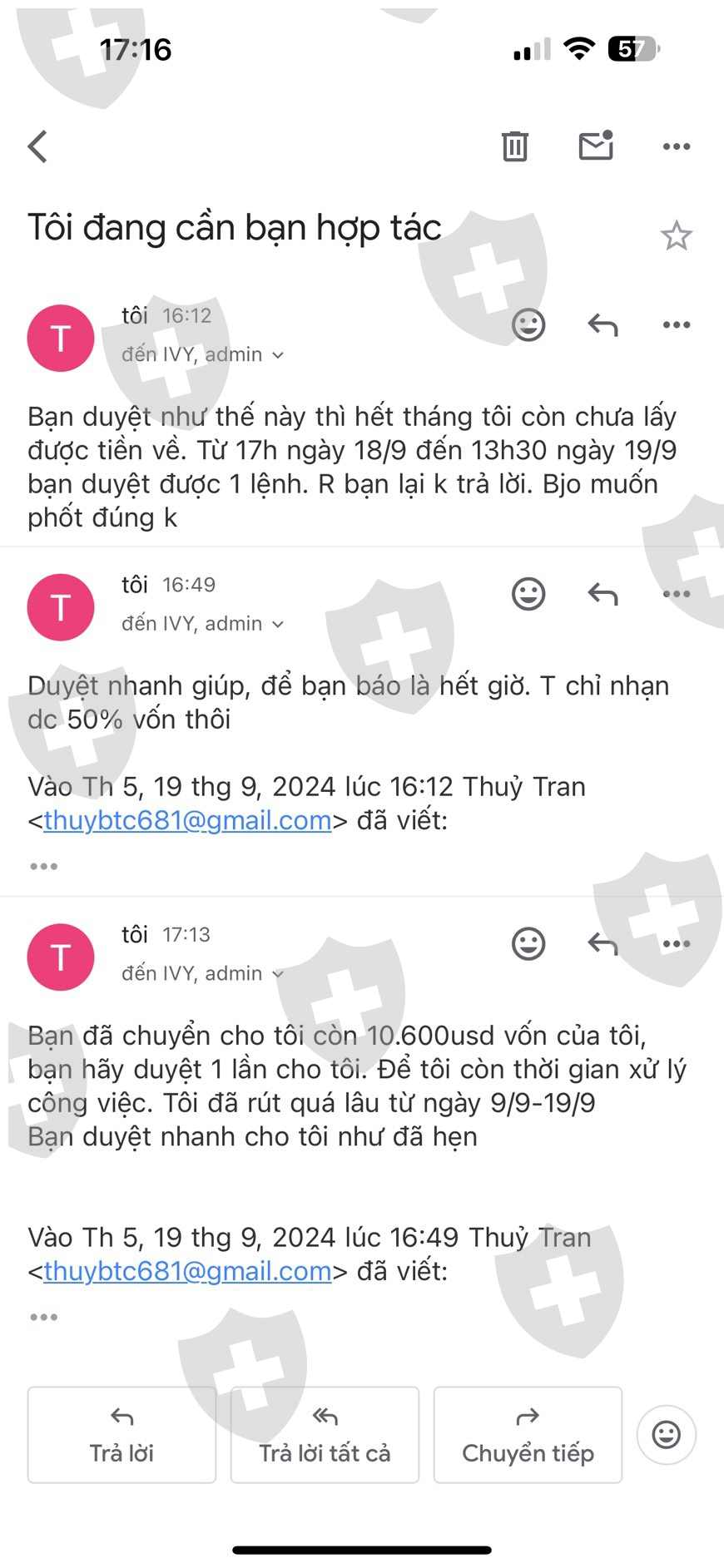 Ngày 9/9/2024 tôi nhiều lần rút vốn của mình ra, nhưng sàn cố tình chặn k cho rút vốn, . đến ngày 19/9/2024 tôi tố cáo lần nữa sang mới trả vốn hết cho tôi, với mỗi lần là 3k.