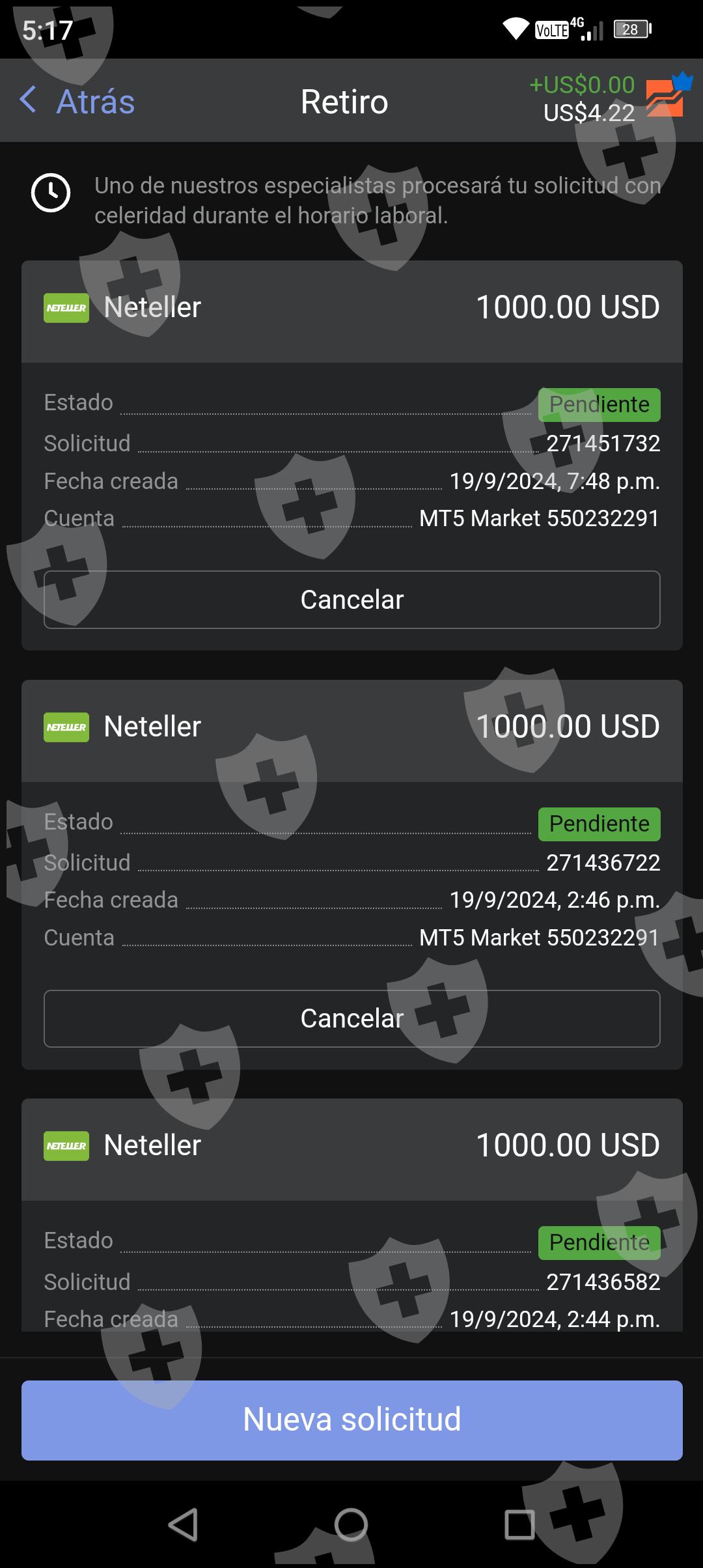 Estaba trabajando con el broker Libertex y no había tenido ningún problema, podía depositar y retirar sin problema. Eso si mis ganancias eran menores a $1,000.00 USD. Pero apenas logre tener ganancias tengo en la cuenta $3141.52 USD y desde el viernes 19 de septiembre del 2024 no ha procesado mi retiro de dinero. El martes 24 de septiembre del 2024 después de llamar me llego una notificación qué la cuanta qué decía que no estaba verificada. Así que subí los datos de verificación. Y decía que de 1 a 2 días hábiles me darían respuesta. Al día siguiente el miércoles 25 de septiembre seo 2024 me metí a la aplicación y había una notificación qué decía que si no agregaba captura del método de pago donde viniera el nombre de la empresa de ellos, el monto de dinero ingresado, fecha y hora, mi correo electrónico, el link de la plataforma donde se hizo el pago y el logotipo de la empresa que utilice para hacer el pago. Si no agregaba una captura agregando todo eso mi cuenta iba a ser suspendida