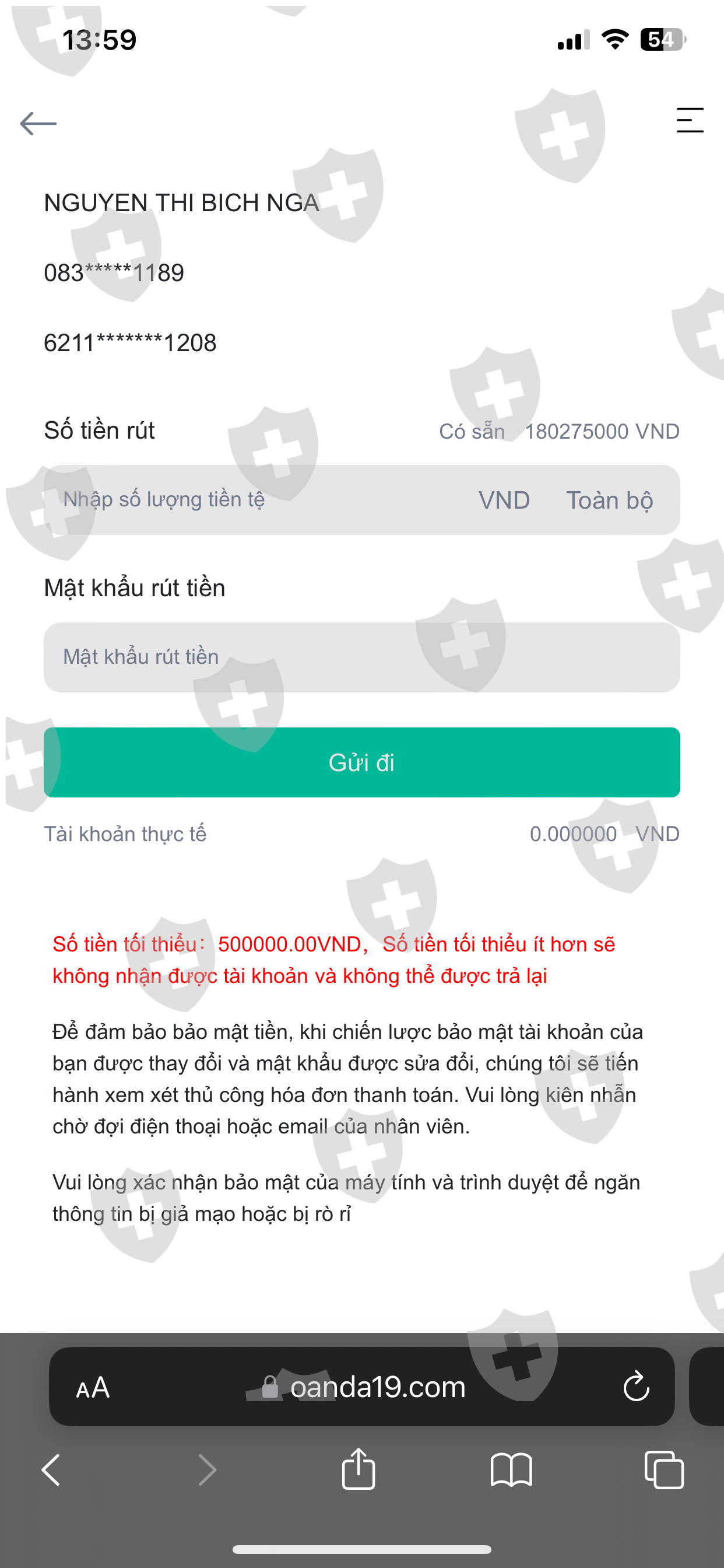 Sàn lừa đảo. www.oanda19.com Mình nạp vào 10 triệu và sinh lợi nhuận lên 20 triệu thì mình rút thử và sàn cho rút. Mình nạp thêm 130 triệu và lợi nhuận lên 180 triệu, mình rút tiền thì sàn nói tk k đủ, phải nộp thêm 112 triệu mới cho rút.