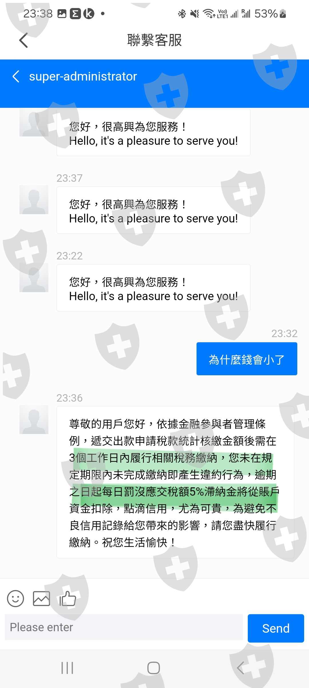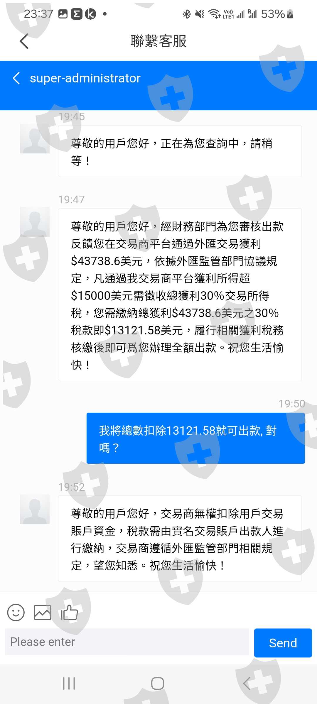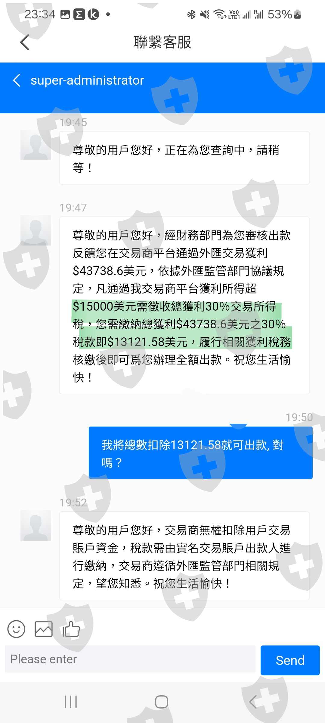 有位男生说带我赚钱,最初进了US3000,几次操作有赚,也能顺利出金.后来加到US30,000,一直也有操作也有赚钱,赚了大约US47,000.后来要求出金不成功,客服告知利润超过US15,000,需要支付30%税款,大约US13,000,要在3天内提交,否则每天在账户扣除5%罸金.此出金要求在平台完全没有提及.当要求出金时才被告知,根本就是欺诈.我没缴税,现在每天被扣5%也不知道能怎么办