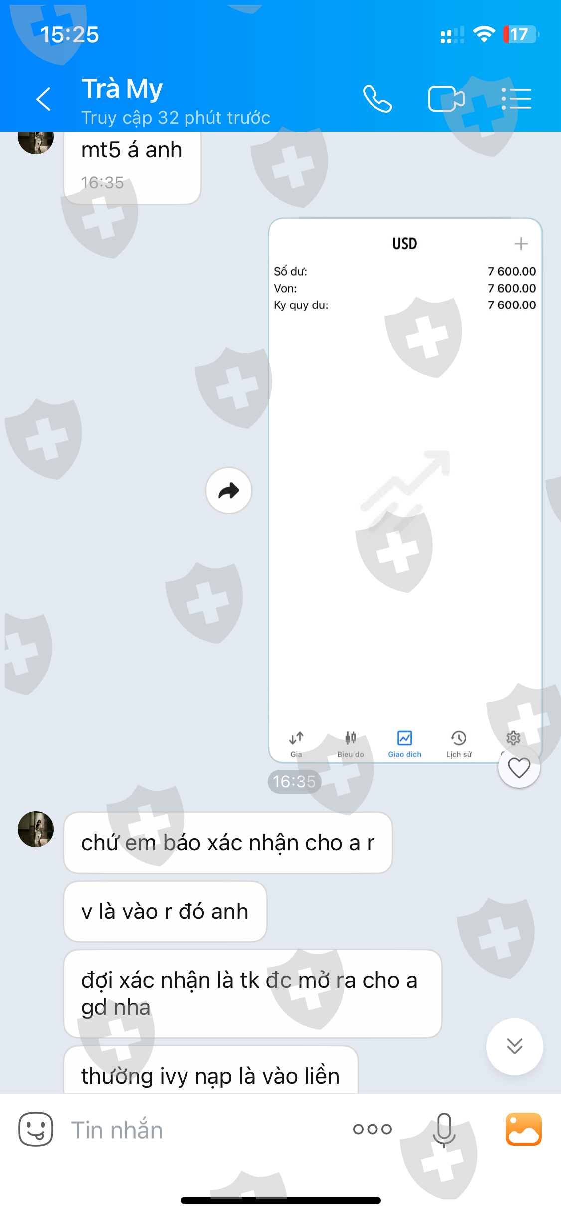 Năm 2023 tôi tham gia sàn Alphatradinghub, Exness,Lite Finace và thua lỗ.Trong đó sàn scam Alpha cho ib cố tình làm tôi cháy tài khoản.Đến tháng 08/2024 có người gọi điện tự xưng bên Metaquotes nói tôi nằm trong chương trình bảo hiểm vốn và bảo tôi mở 1 tk từ những sàn uy tín như Exness,Xtm, Xm, Ivy… để tham gia.Lúc đầu tôi không tin.Nhưng nhìn vào hình ảnh show nhiều người lấy được tiền,quỹ có back tiền vào tk cộng với lúc đó tôi thực sự cần tiền nên đã đi vay mượn để tham gia. Tôi được chèo kéo mở tk bên sàn Ivy sẽ có hỗ trợ tốt.Tôi mở xong thì tk được cộng 5000$ đúng với số tiền đã mất.Rồi tôi được giới thiệu 1 người khác làm việc trực tiếp với quỹ bảo hiểm và sàn. Cả hai nói nếu tôi nạp vào 50% tức 2500$ thì giao dịch 1 tuần không kèm điều kiện hoặc nạp đủ là rút về hết được ngay.rồi có một người lạ nhắn tin hỗ trợ tôi đi lệnh và làm cháy, lúc đó tk được hơn 9k$.Sau đó quỹ back lại 9200$ và giục tôi vào tiếp để lấy lại.tôi đã bị lừa, giờ chỉ muốn lấy lại tiền gốc 2600$ đã vào
