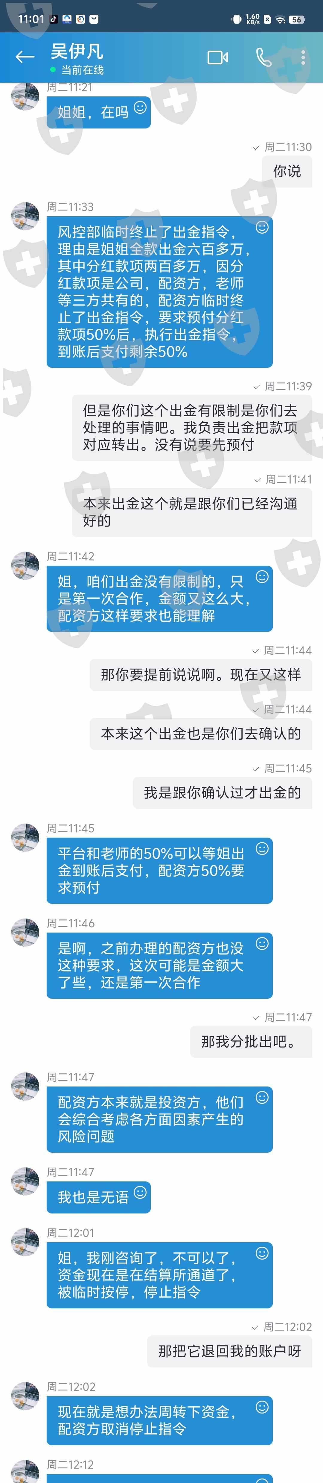 2024年9月下旬入金操作,因是和狮子期货有限公司合作操作,2024年10月中旬申请出金,要求缴纳税金再才能安排出金,已按照他们要求缴纳税金后又说风控部临时终止出金指令,要求先预付50%的服务费才能执行出金指令。按照合同约定是本人出金后才安排服务费,但是狮子期货有限公司卡我出金。