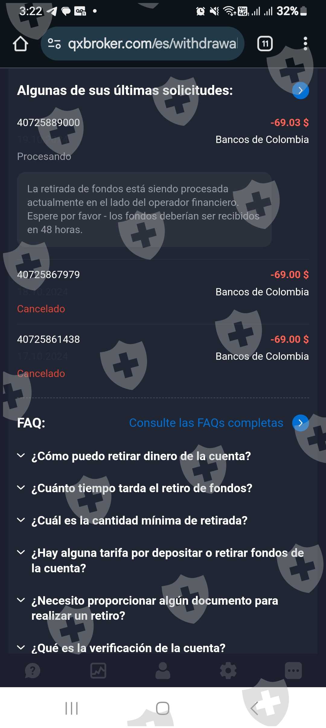 Junto con mi esposo creamos dos cuentas en quotex y realizamos dos depósitos por 69 dólares y otro por 60 dólares, no aceptamos códigos de promoción ni nada parecido, llevamos una semana haciendo los retiros y no ha sido posible dicen que el retiro se encuentra siendo procesado por el operador financiero y luego devuelven los fondos argumentando que el operador financiero hizo devolución algo que es falso hemos escrito a los correos sin respuesta y más que los correos es el único medio de comunicación con servicio al cliente, este brocker es una estafa