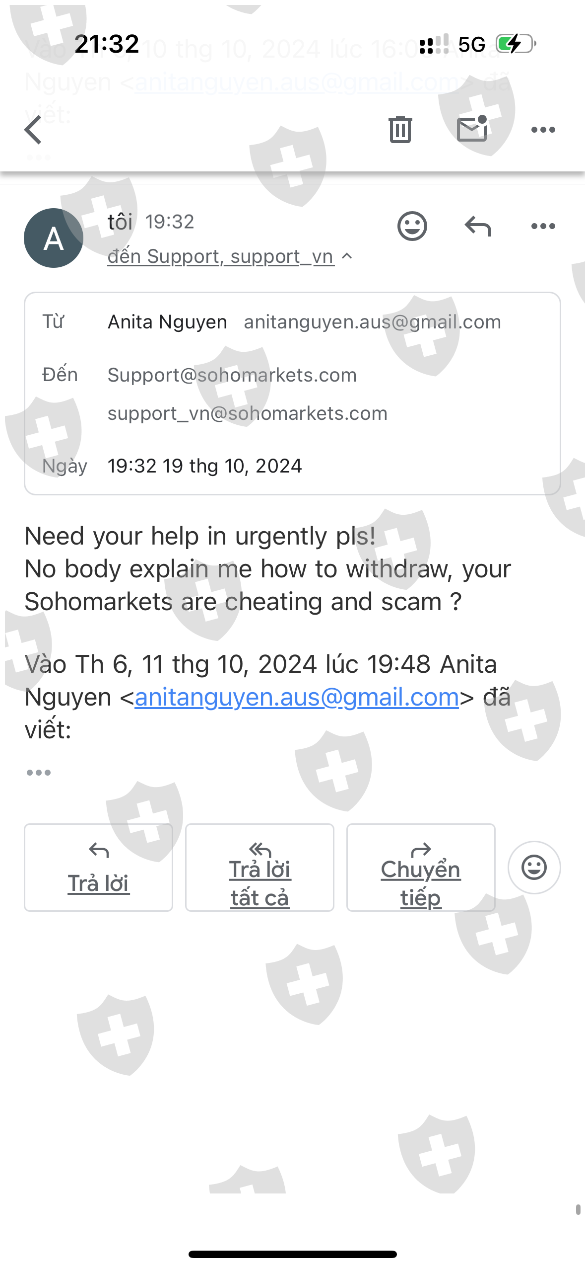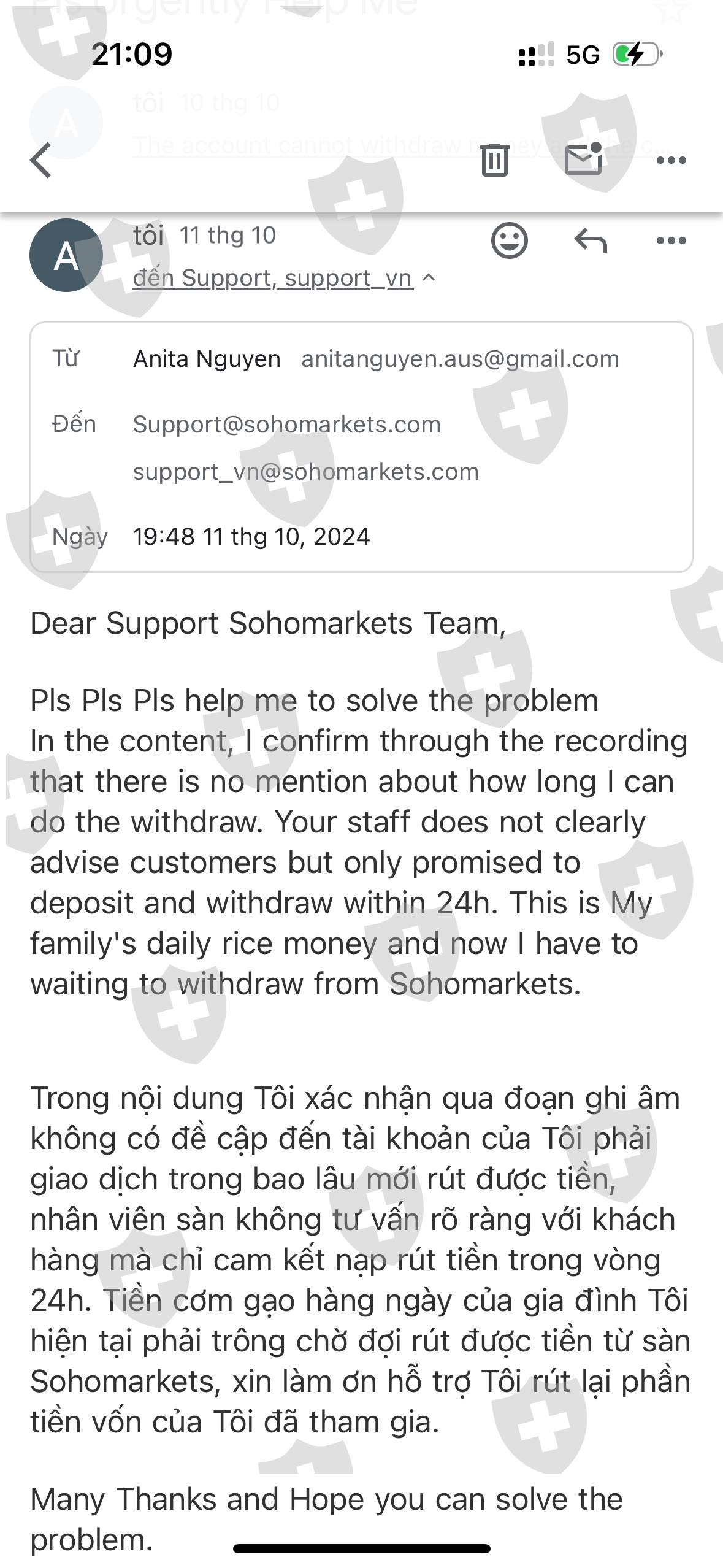 我于 2024 年 10 月 4 日下达提款指令,至今已超过 2 周,并多次发邮件,但没有人愿意解释我的投资金额被扣的原因 Support@sohomarkets.com support_vn@sohomarkets.com 两封支持电子邮件 不是吗是真的还是什么,你为什么不回应? Sohomarkets 诈骗投资者钱财?如果是信誉好的交易所,为什么不能提币,也不能取消提币指令,却说提币指令长达17天尚未解决?我请求 Sohomarkets 处理我的提款订单,目前我的账户已停止交易,直至处理提款订单。