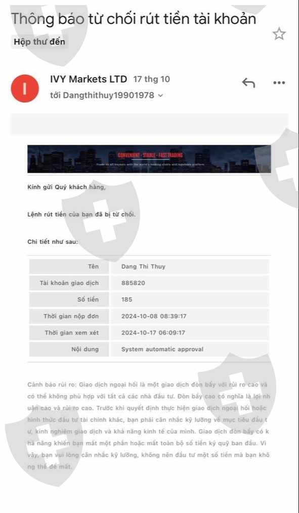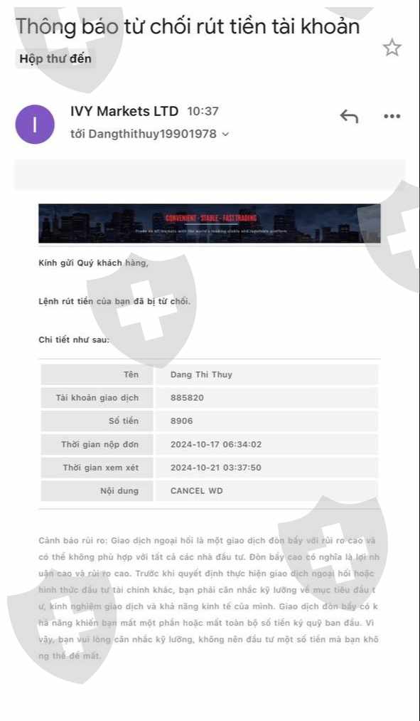 tôi nạp tiền 10.000$ và giao dịch lãi 4.000$ hơn nhưng tôi rút 5000$ không dao nhưng đến khi tôi rút 8.000$ còn lại thì họ mới báo khoá và thông báo tài khoản tôi vi phạm xin mọi người chú ý lừa đảo của sàn ivy