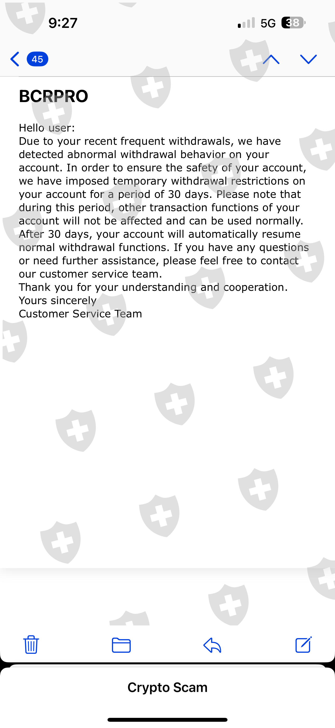 i start investing on bcrpro after my amount reach a certain amount of 6114$ after i couldn’t abale to withdrawal the my fund they refused to withdrawal my fund and they mail me my account is restricted for 30days they don’t want to take my amount they are totally scammer be aware