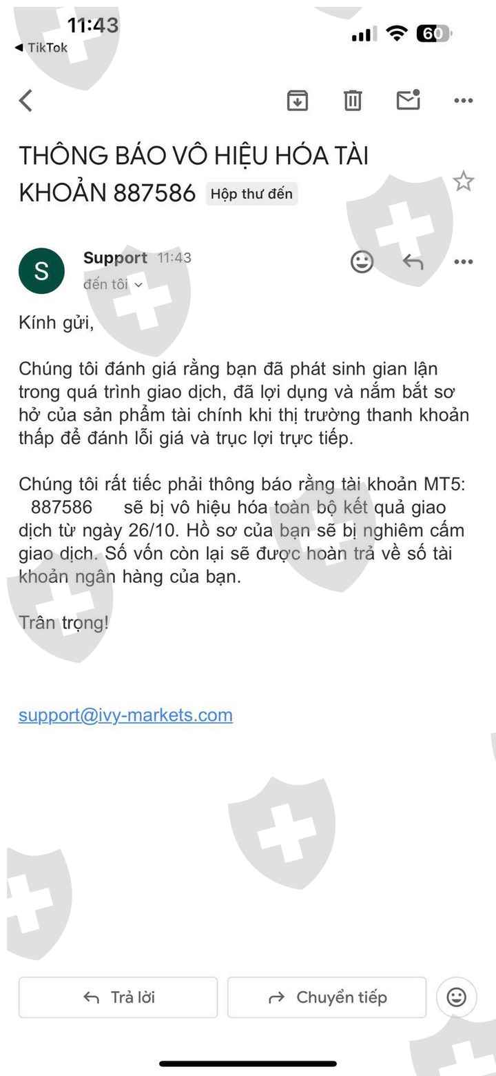 - Tôi có tham gia đầu tư tại sàn IVY MARKETS nhưng sau gì đầu tư vốn 70.000 USD và đầu tư lời nhuận 146.000.000 USD thì rút không được và sàn đã tiến hành thu hồi hết tiền của tối với lý do gian lận , trong khi đó tôi giao dịch mọi thứ đều theo giá cả thị trường , tôi thấy đây là dấu hiệu của việc lừa đảo , rồi viên lên đây cho mọi người cảnh giác , và tôi sẻ đâm đơn kiện lên cơ quan công an , ngoài ra phốt ở tất cả các trang mang để mọi người né tránh .