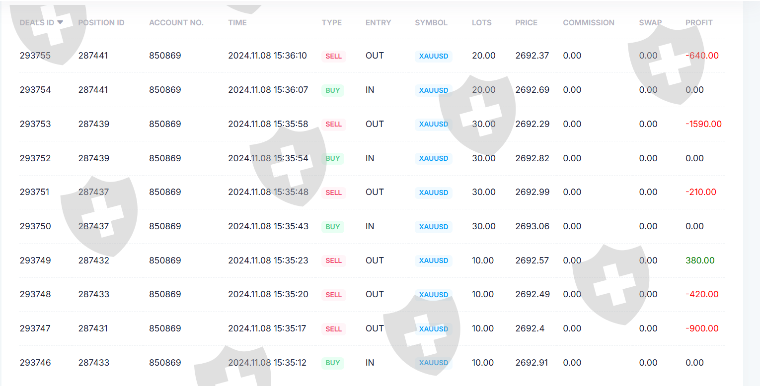 我的交易账号为 850869。昨天(2024 年 11 月 8 日)我向我的交易账户存入了 7,000 美元,并收到了 2,450 美元的奖金(35%)。然而,仅仅大约30分钟后,我就无法再登录我的MT5账户了。我以为这个软件有问题所以没有检查。第二天(2024年11月9日),我仍然无法登录我的MT5账户,当我检查我的交易账户时,我发现存款为负值。我查看了交易记录,发现有人在短时间内自动连续下了很多买/卖订单,交易量很大,导致账户出现大量负资金。我已联系 Enzo FX Global 支持寻求帮助,但尚未收到回复。