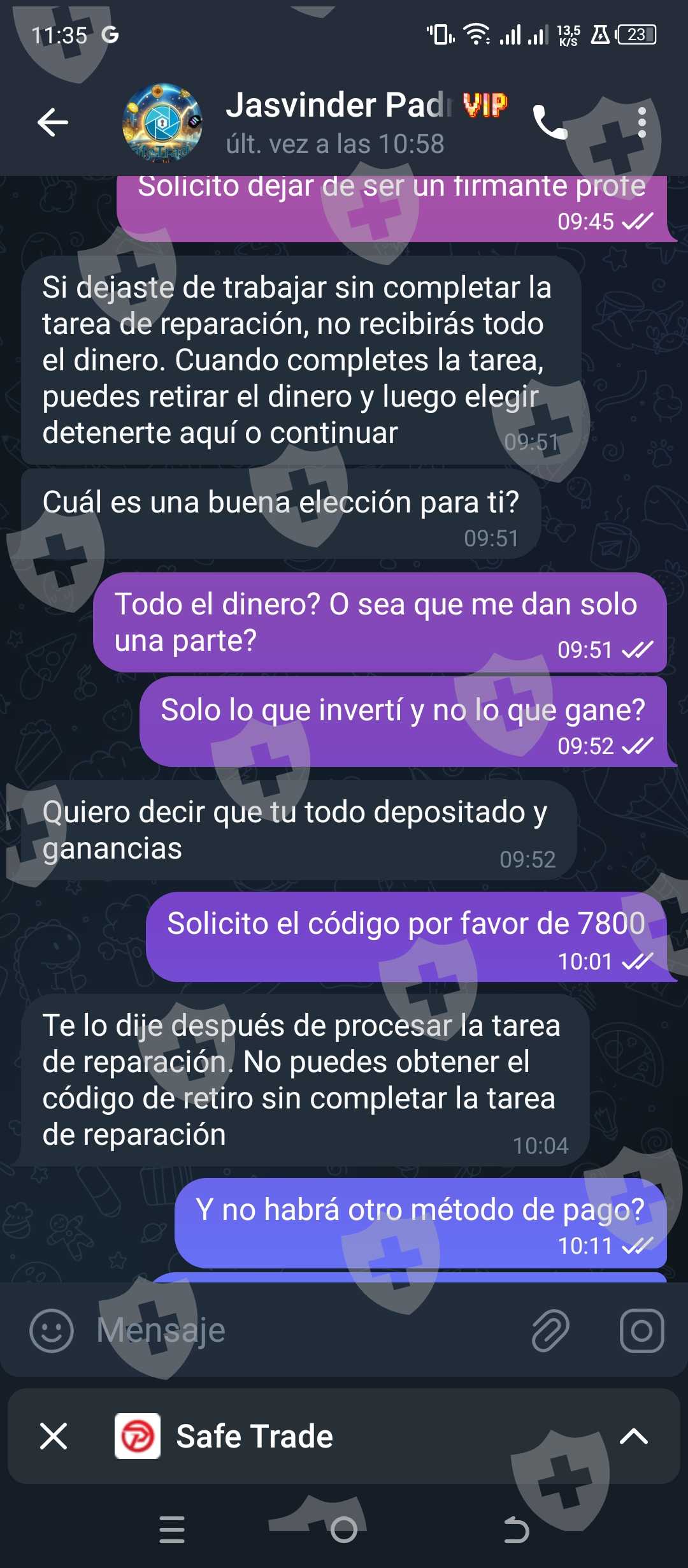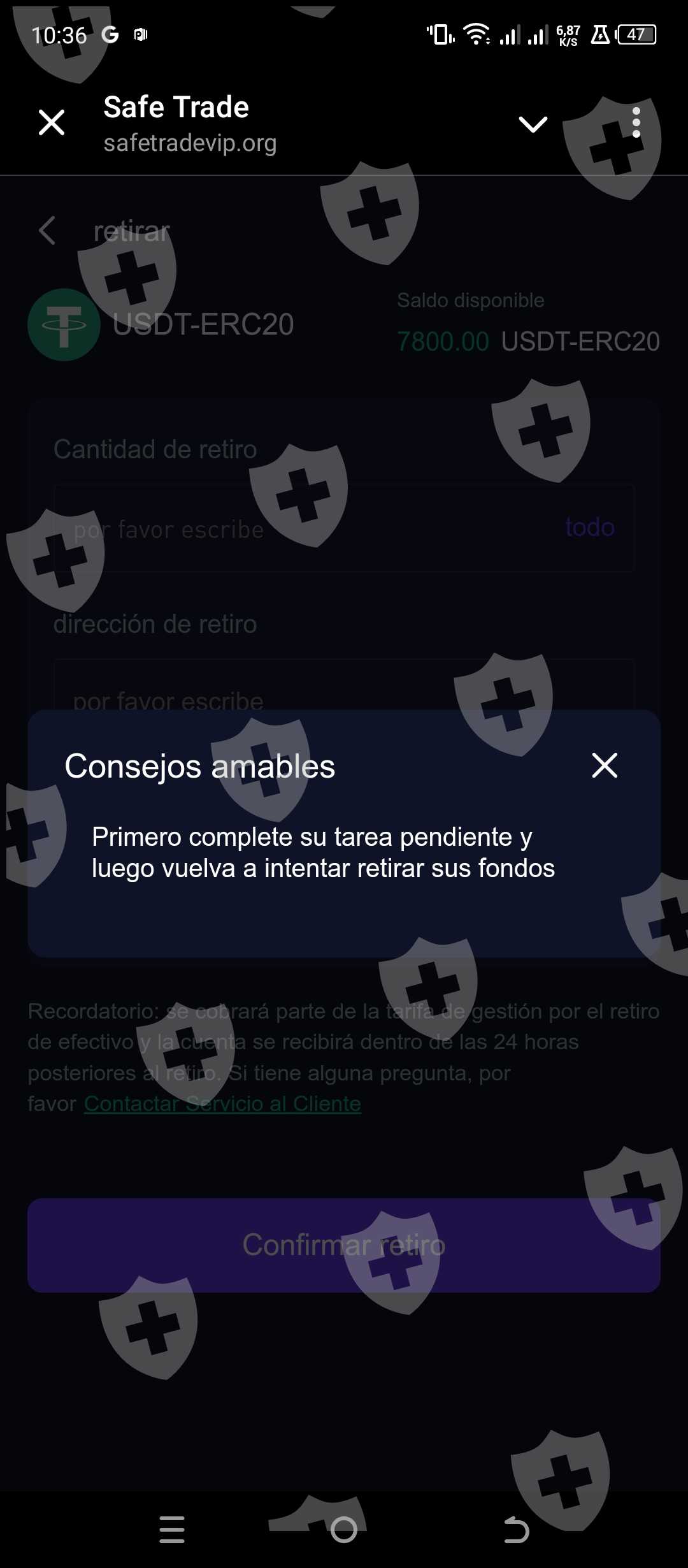 El 21 de octubre hice mi depósito, me dijeron que me darían el código de retiro, pero ahora me salen con otra tarea con un monto aún mayor que la anterior. Y no me dejan retirar mi dinero si primero hacer el depósito para obtener mi saldo. La plataforma se llama Safe trade vip