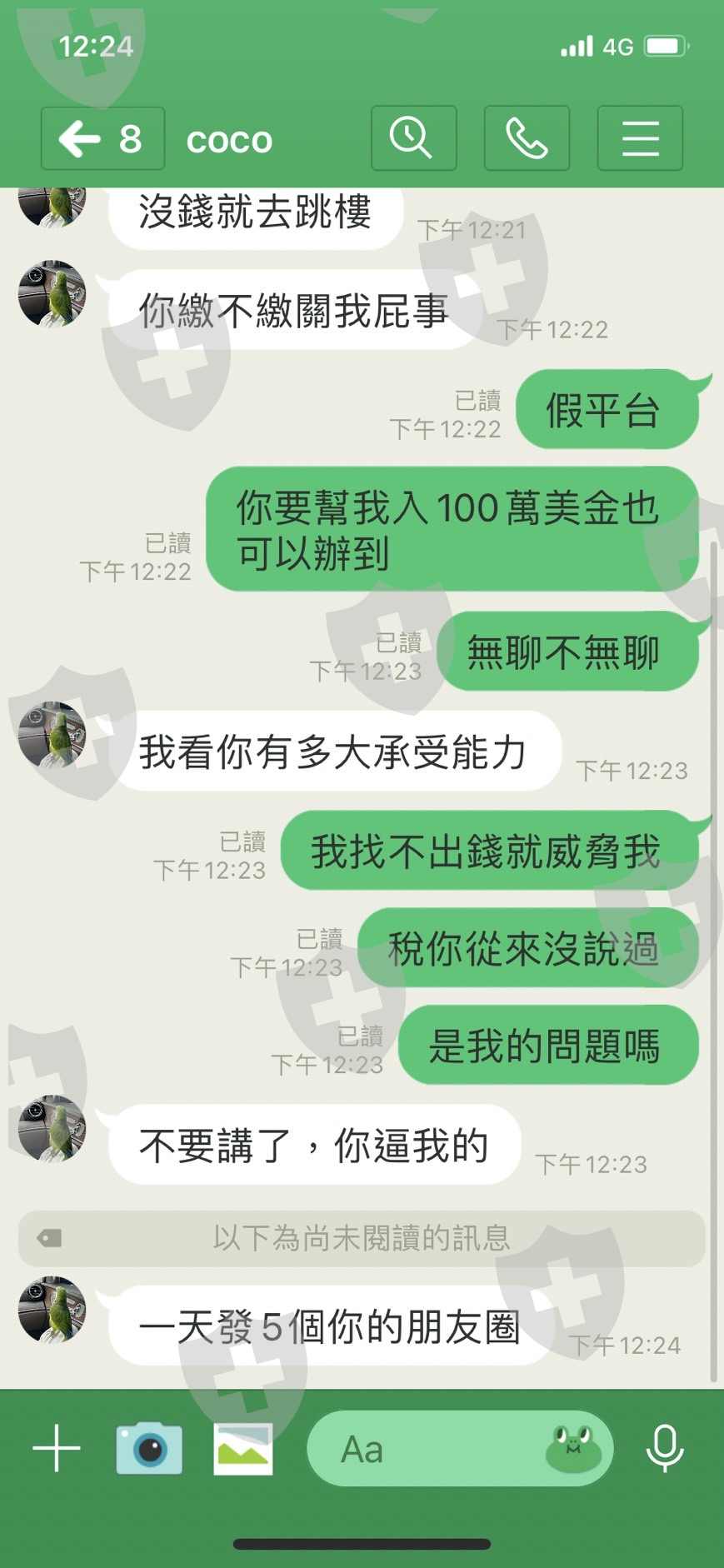 之前跟老公吵架一實想不開就去玩探探,誰知道遇到惡魔一開始假裝很溫柔卸下我心防後還騙我私密照,還說她會幫我入金一半到平台算是無償借我的因為愛我什麼的,我相信了不只給了他我的私密照,小朋友的教育存款3萬多美金也一起放進去,本來賺錢都很順利平台卻突然說要繳稅,我哪有錢再繳,跟老公拿錢他也不給真的很過分,現在網友一直拿私密照威脅我繳稅後還錢希望大家能幫幫我,真的不知道怎麼辦了