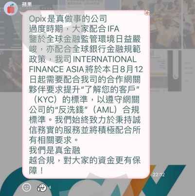 一開始是這樣的,被一個算是認識但不熟悉的朋友邀請去聽說明會,一開始對方就開始講現在通膨多嚴重,電費什麼的都要漲價,然後問我們知不知道現在錢放在銀行一個月只能領多少,買儲蓄險一年只能領多少,後面就給我們看獲利表說入金OpixTech多少錢每個月都可以領多少錢,按照他們的方案最快的方案(金額最高)半年就可以賺回本金,還說可以當經紀人拉人朋友來還可以抽錢這些,一開始我也沒被騙單純覺得活動還不錯但還是怕怕的不敢入金,但後來那個朋友一直洗腦還發一疊一疊現金的照片才被她騙進去!,前面網站看確實金額都有按照說好的一直上升,但後面我要提領的時候就說什麼國外都在要KYC所以會比較慢,結果根本無法出金,後面說OpixTech跟IFA達成合作在韓國簽什麼協議會整合在一起,但我要在入金IFA才能把前面OpixTech的錢領出來,結果我又入金一次,現在要領都領不出來了不知道怎麼辦才好