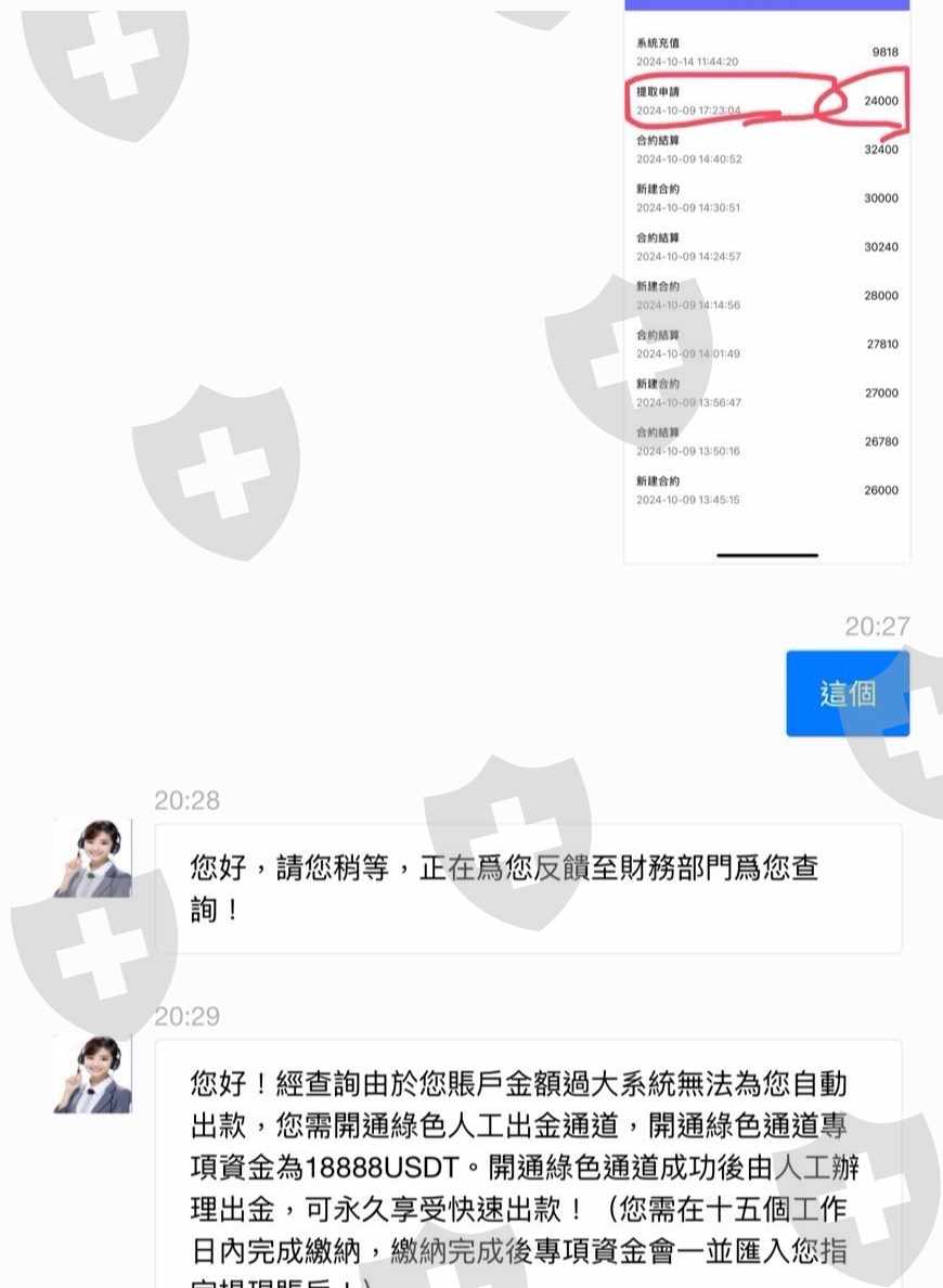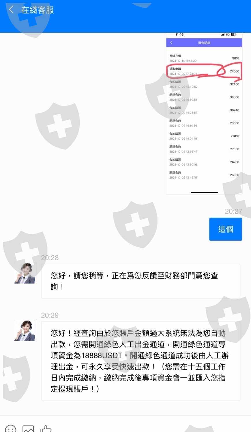 第二次說 提領金額過大要開啟綠色通道 18888 USDT