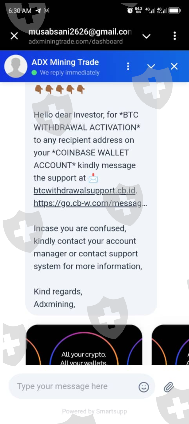经纪人 adxmining trade 把我的钱寄给我 coinbase钱包 6000 美元,并告诉我联系 btcwithrawlsuppotcbid coinbase我花了 2500 美元取钱包,但他们没有给我