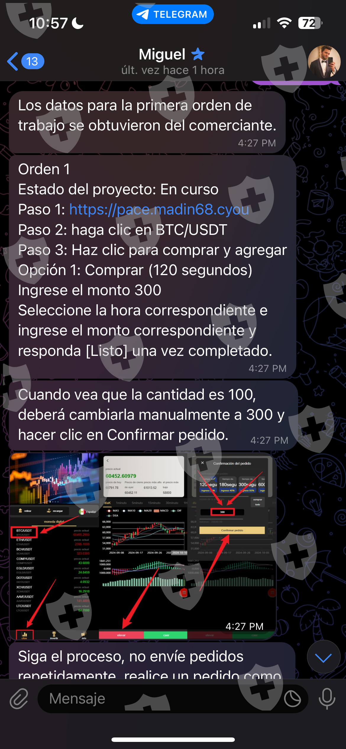 他们通过 Telegram 联系我,告诉我,我只需点赞 Instagram 帖子就可以轻松赚钱,然后他们要求我通过转账存款来投资货币或外汇节点,诸如此类。关键是他们首先向我索要 300 墨西哥比索,然后是 800,然后是 6900,然后是 19600,然后是 23343 以及所有能够取出我已经投入的资金的东西,我一直存款,因为我想拿回我的钱,并根据最后一件事他们已经要我退货了,但神奇的是,我少了 2 个信用点(98,而根据实际情况应该是 100),所有这些都是为了能够提取钱,所以他们告诉我,我必须购买它们并且这将花费我 40,000 比索,就在那时我决定不再这样做,我发现我已经陷入了他们的骗局。请帮我