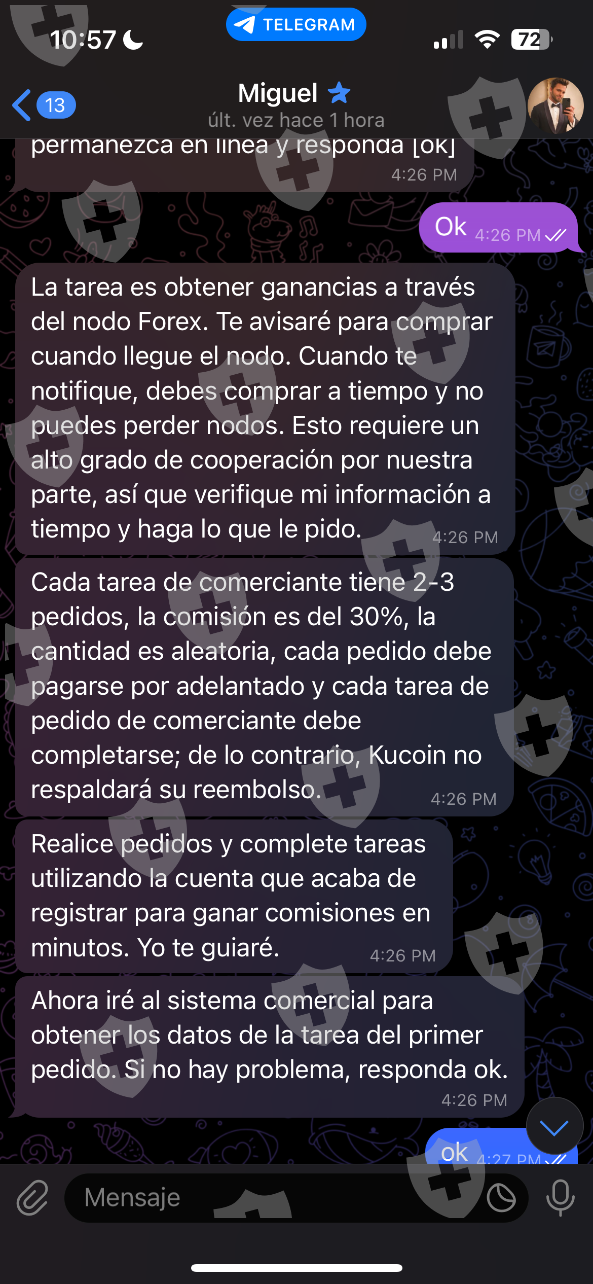 Me contactaron por Telegram diciéndome que podía ganar dinero fácil solo dando likes a publicaciones de Instagram después me pidieron hacerles depósitos por transferencia para invertirlos en divisas o nodo del forex algo así. El punto es que me pidieron primero 300 pesos mexicanos luego 800, luego 6900, luego 19600, luego 23343 y todo para poder sacar lo que ya había metido, yo seguía depositando porque quería mi dinero de vuelta y según con eso último ya me los iban a regresar pero mágicamente resulta que tengo 2 puntos créditos menos (98 cuando deberían de ser 100 según) y todo eso para poder retirar el dinero entonces me dijeron que tenía que comprarlos y me iba a costar 40000 pesos fue ahí donde decidí ya no hacerlo y vi que había caído en su estafa. PORFAVOR AYÚDENME