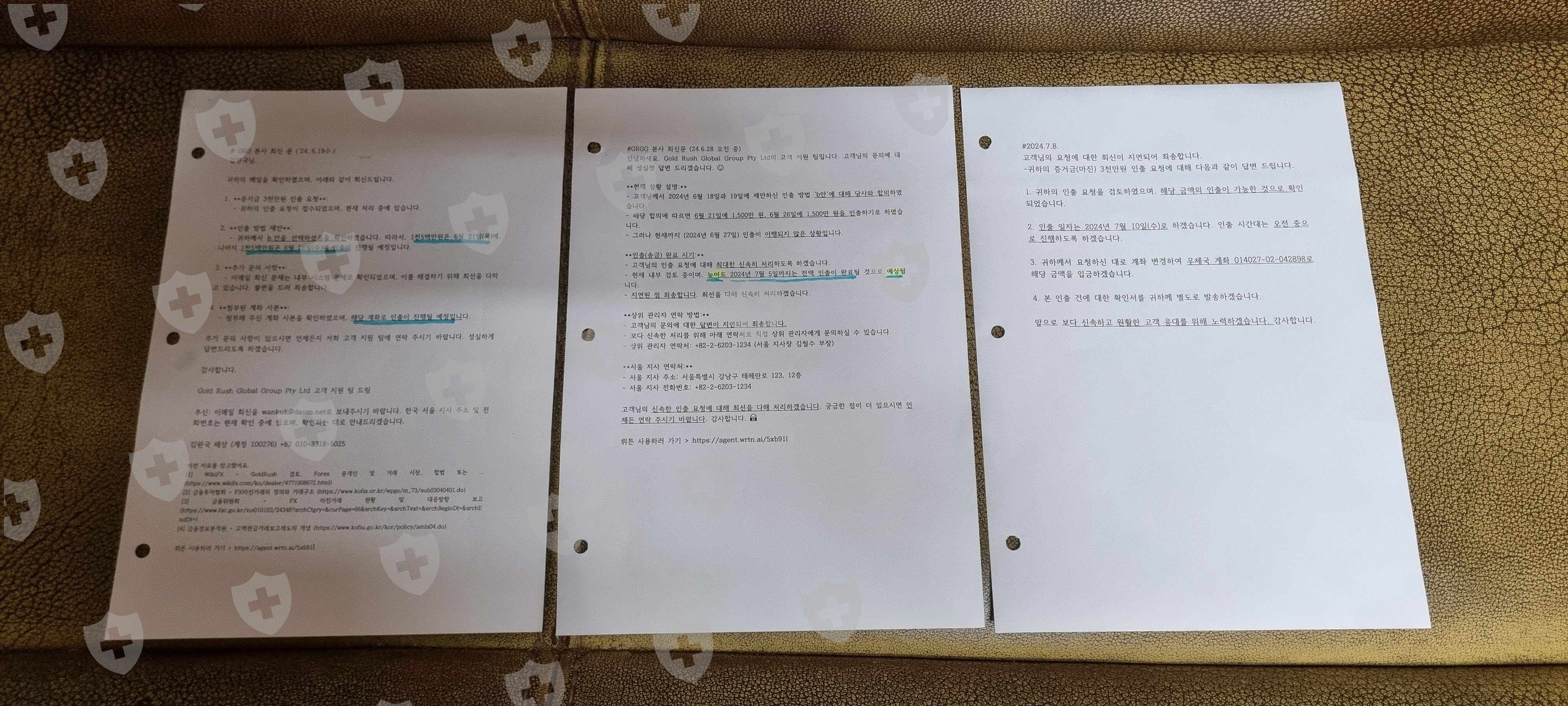 5. 회사와의 "이메일 소통 창구 부재" 문제로, 100통 이상의 이메일을 송부했으나 모두 회신받지 못했습니다. 또한 한국 지사의 존재 사기, 증거금 인출 시 추가 비용 요구 등의 문제가 발생했습니다.