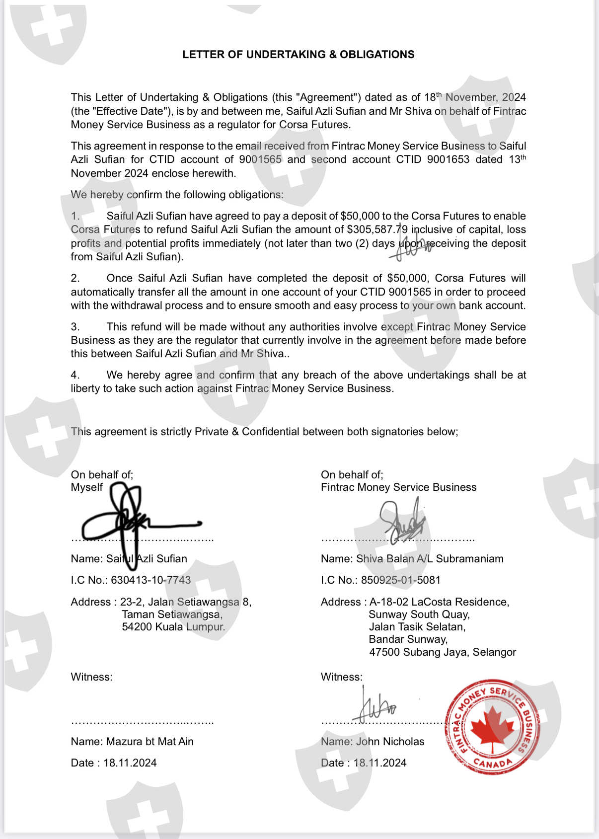 LETTER OF UNDERTAKING AND OBLIGATIONS FOR REFUND RETURN (refer to picture) DUE TO CAPITAL PROTECTIONS SIGNED BY SHIVA AND JOHN NICHOLAS IS NOT ADHERED BY THEM.