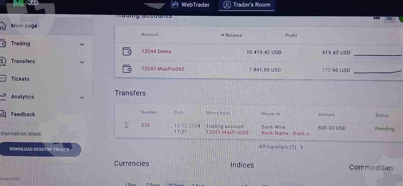 从 Max Pro 365 给我打电话,或者以教我交易为借口让我投资 500 美元,把一个叫 Hare Krishna 的人称为交易专家,或者强迫我投资 5000 美元,交易了 10 到 12 天,或者显示盈利,但一直在提款。他们谈到做一个大账户,但我在 13/12/24 开始处理提款。我看到账户中有 3 到 4 小时的提款,或者在第二天的交易中有一个波动带。克里希纳出现在所有录音中。从今天早上开始没有人打过电话。请退还我的钱。
