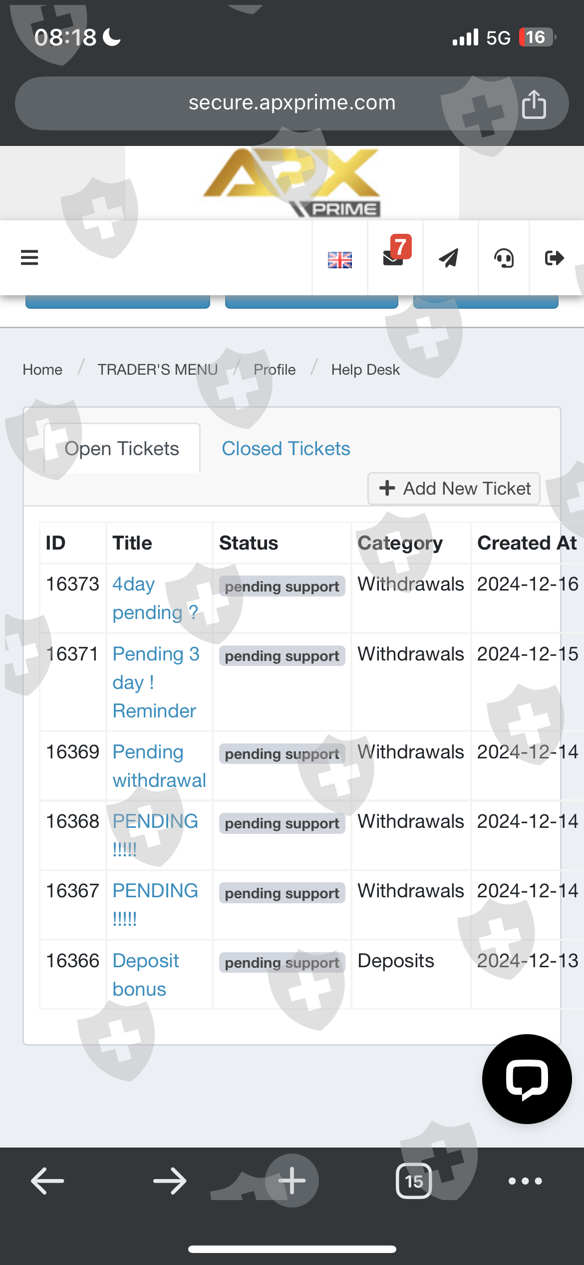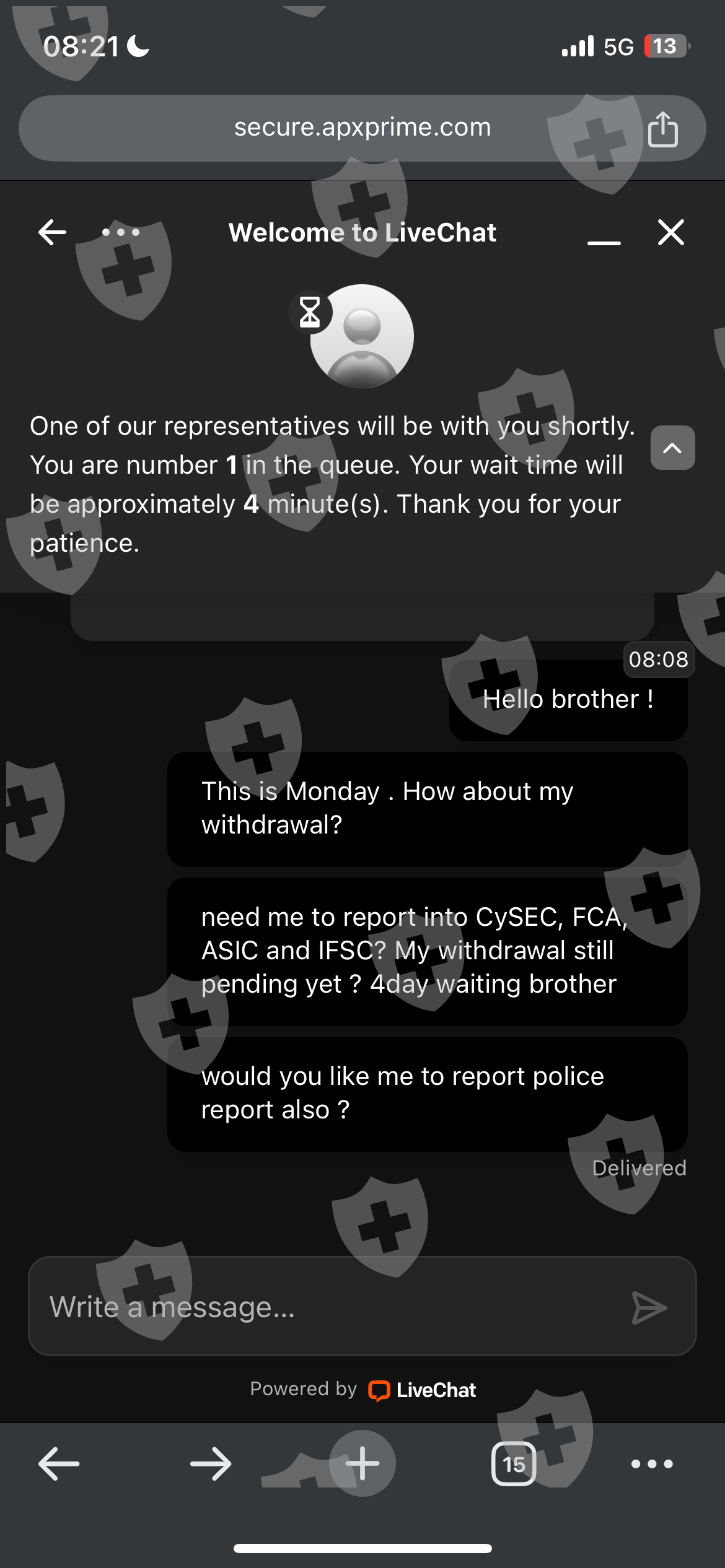 要求等待 4 分钟却没有支持?创建票证无人回复。 APX Prime是来自马来西亚加影的亚洲人。 aliff izzudin 你想拿走我的钱吗?我把我父亲的脸带来了!解决我的提款问题兄弟。不要卷走客户的钱