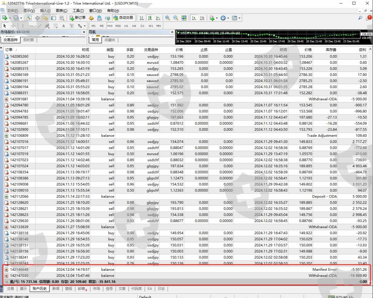 本人谢华蓥,登录ID: 12042774,于2024年经业务员介绍在TRIVE平台网址(https://www.trive-cn.com/)开户进行交易,持续在该平台交易了一个月,开始时因为对行情判断失误,导致账户亏损,期间一直入金,以免账户爆仓。中期时开仓、平仓,有亏有盈,出入金均正常(此时账户为亏损账户,入金大于出金)。到了后期,行情走向有利方向,账户从亏损变成盈利账户,此时申请盈利出金,平台便对账户进行卡控,后面交涉无果,直接从账户中扣除5951.26美金。对于TRIVE平台这种无理行为,坚决要曝光,提醒广大汇友,远离此黑平台,资金盘。让这种黑平台只能让用户亏损吃头寸,不能盈利的黑平台退出市场。