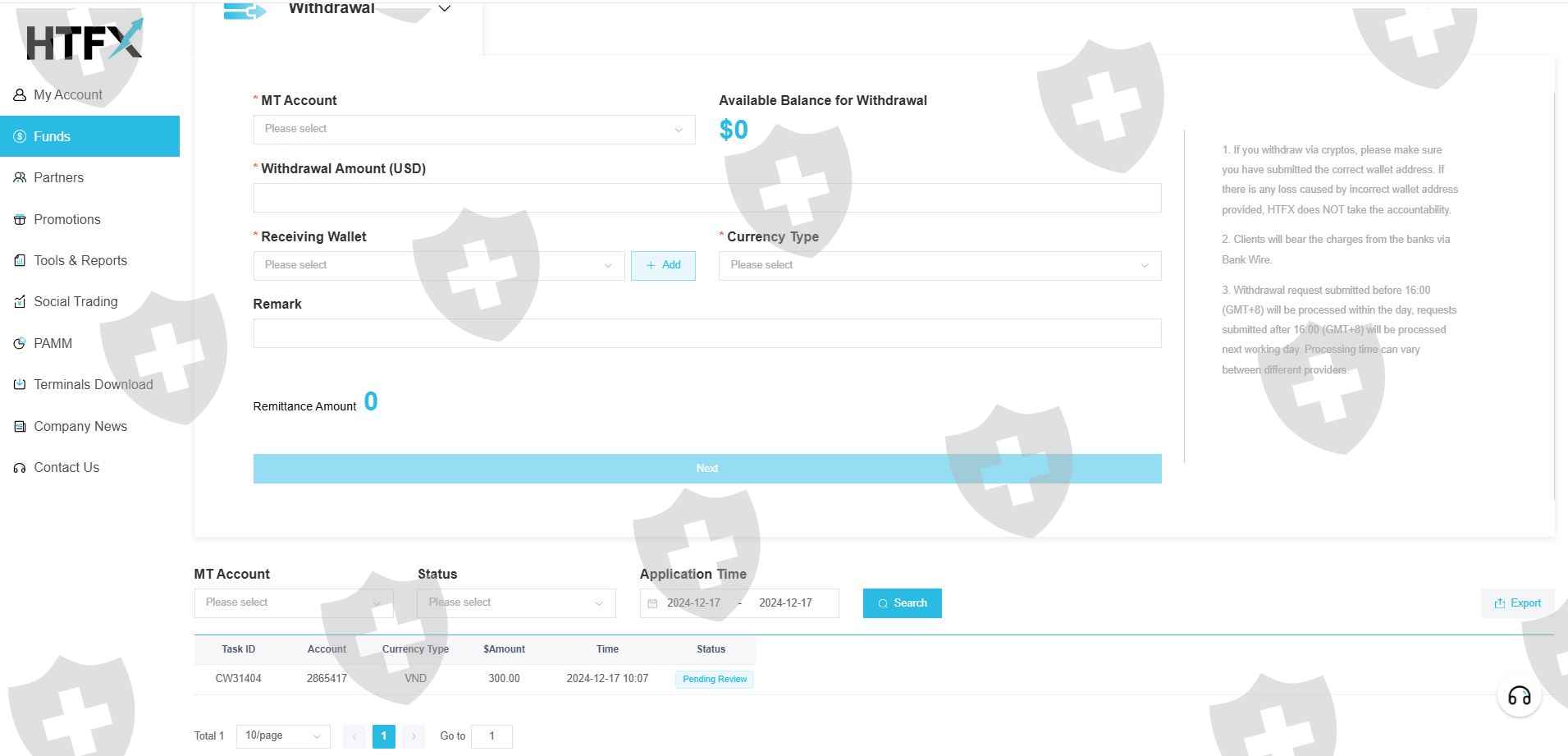 2024年12月17日,我向htffx交易所存入了400美元,我想提取剩余的金额,但当我想提取资金时,交易所不让我提取。尽管我在这家经纪商亏本交易。我们的客户服务系统已经过去近1个月了 HTFX不要回复我的邮件。并且网站上的支持也没有回复消息。这家经纪商在越南倒闭了吗?