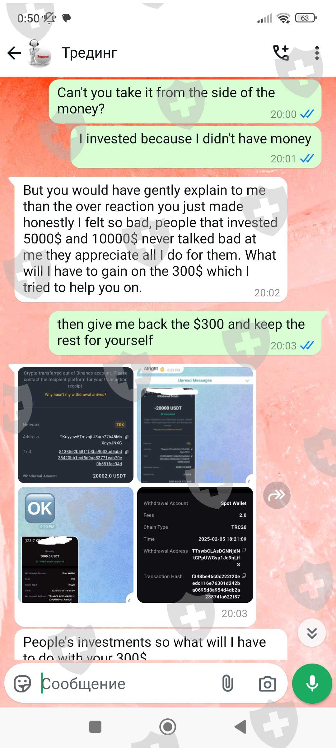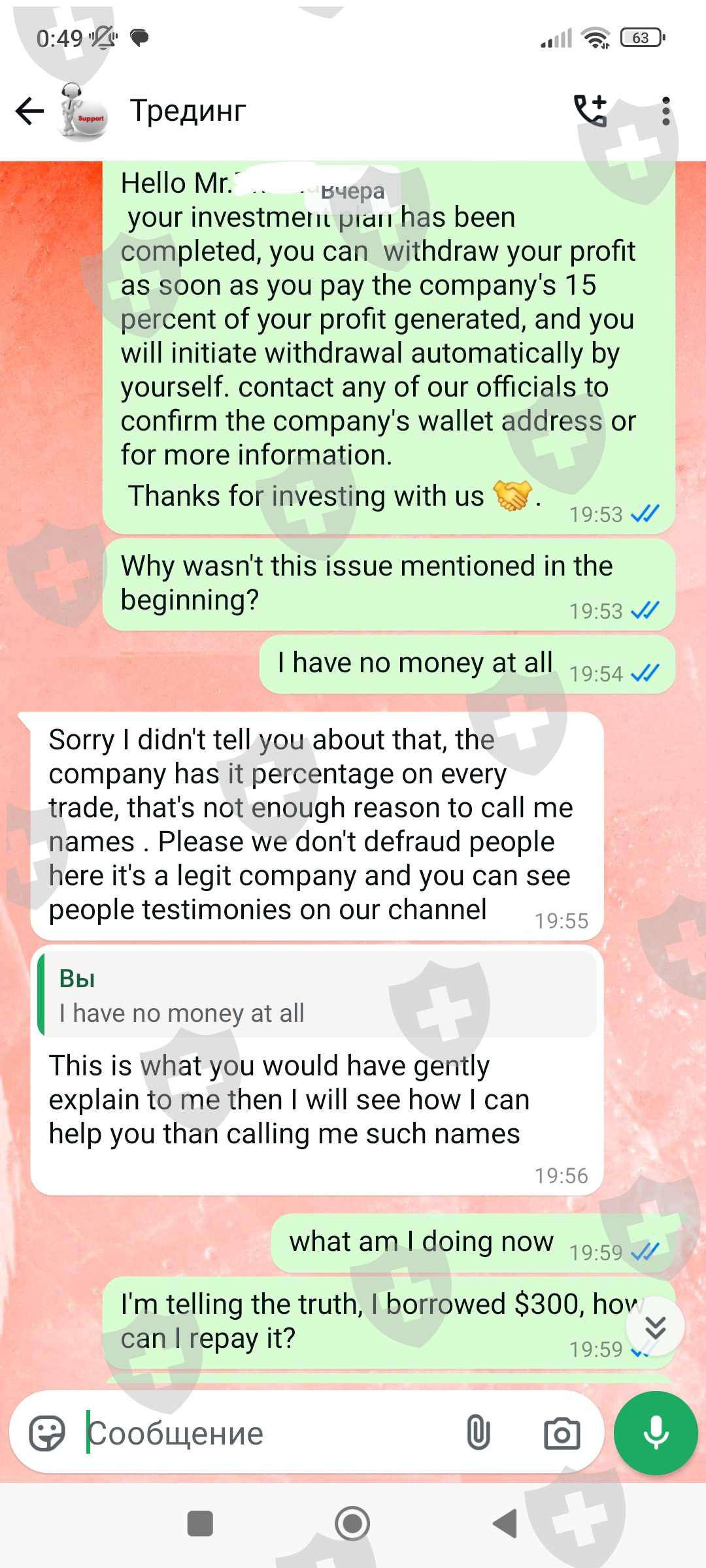 这些家伙在 Telegram 上有一个频道,我投资了 300 美元,他们答应在 5 天内给我 6500 美元。然后他说你支付(5000 美元)利润的 15%,然后你就可以拿到钱了。那时我才意识到他们是骗子。小心不要重复我的话
