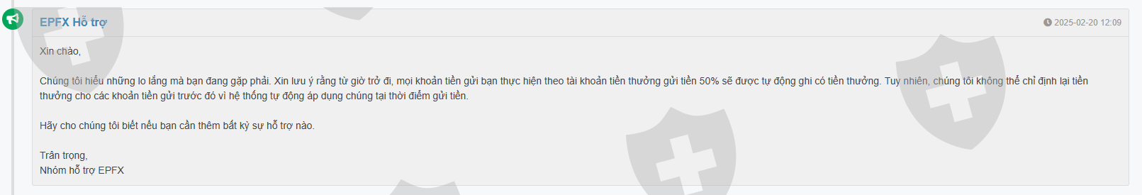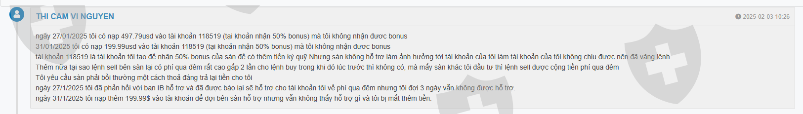 tôi tạo tài khoản nhận bonus 50% và nạp tiền thì không được nhận, giờ kêu đền bù thì sàn chỉ xin lỗi và lấy làm tiếc, nói chuyện vô trách nhiệm