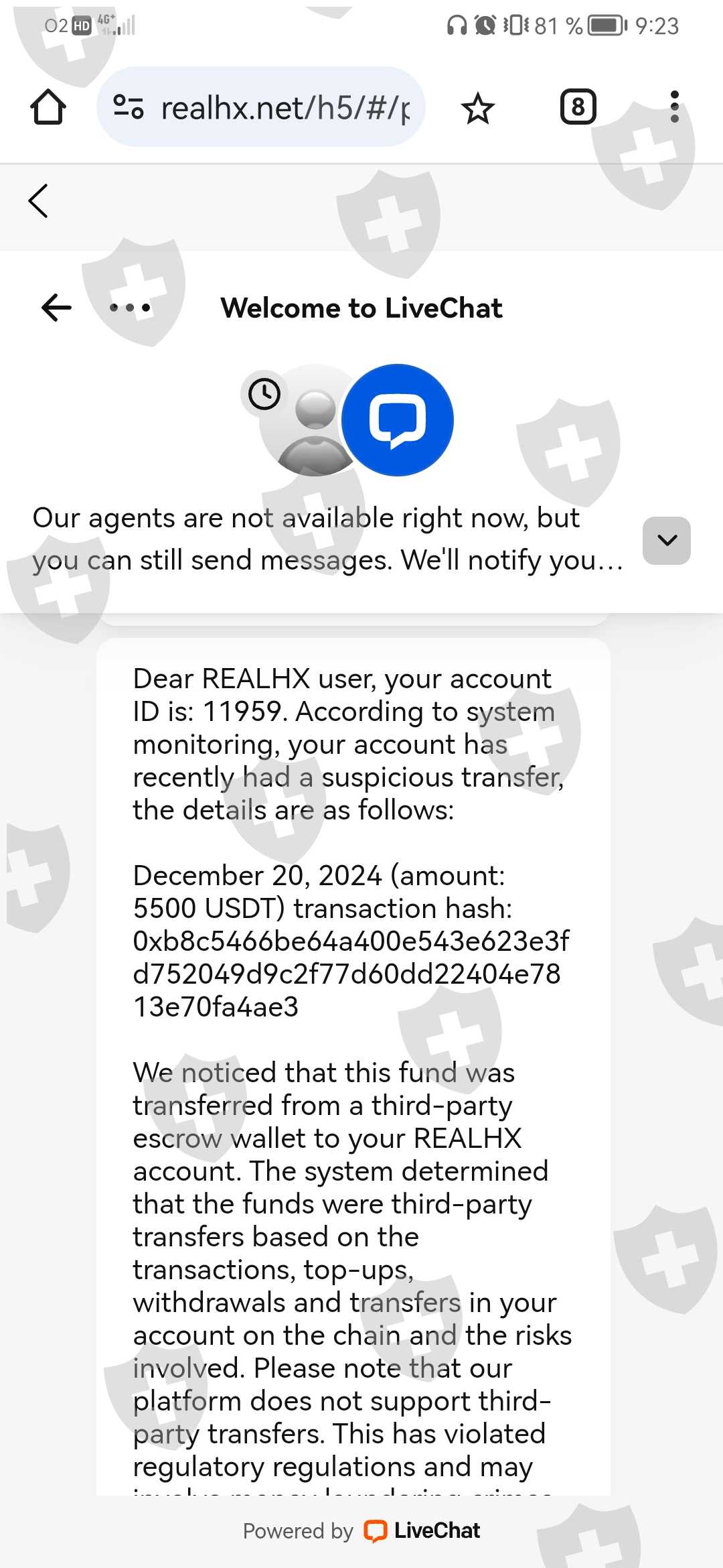 我的资金处于待处理状态已经两个多月了,我无法提取它们。坦白说,我目前所处的经济状况很微妙。就我而言,不算利润,我已经损失了 6 万欧元,平台要求我缴纳税款、作为白金账户存款以便能够提取大额资金,以及支付由于将我纳入平台的人通过直接存入平台“借”给我的钱而造成的账户冻结。网址:https://www. REALHX .net/h5/#/ https://www.aham-pro.com/h5/#/ https://www.globxe.com/pc/#/layout https://www.aham-pro.com/pc/#/layout https://www. REALHX .net/pc/#/layout 平台资金输入地址(更改地址) 0x51155b52125dea14242ac31f3a553bae8e1e1fb0 0xb25288c18442d52e5f3aa74e43875f8a069c8797 0x1a61e3a78d229fdf92c6ad2722512fc5d6002621 0xb24031cfc82d07d9d435310f024865446dfa8c78 #wikifx315forexrightsprotectionday