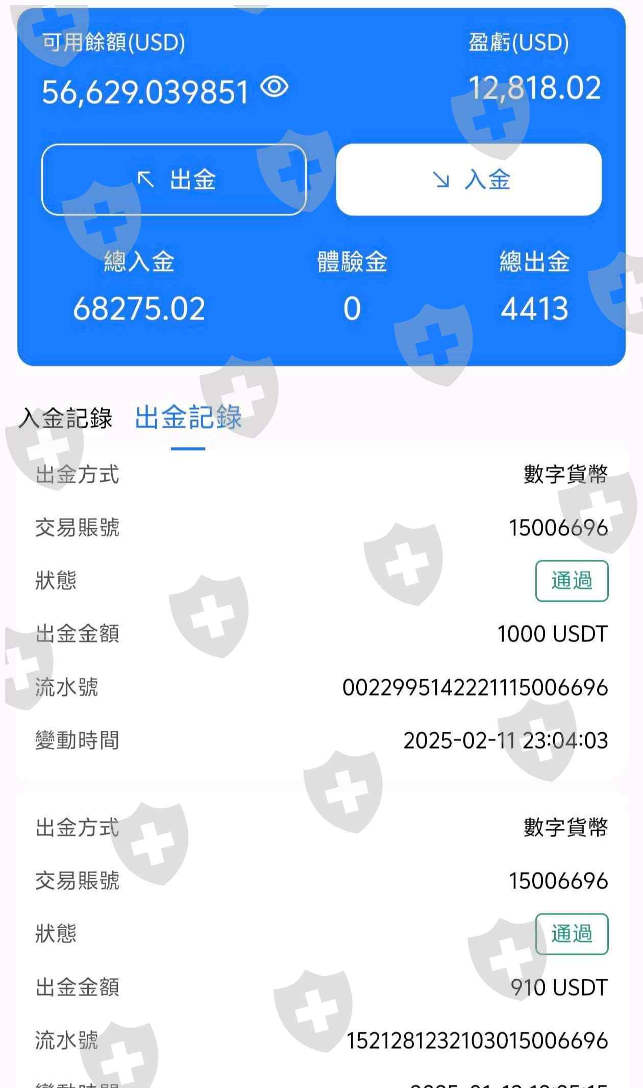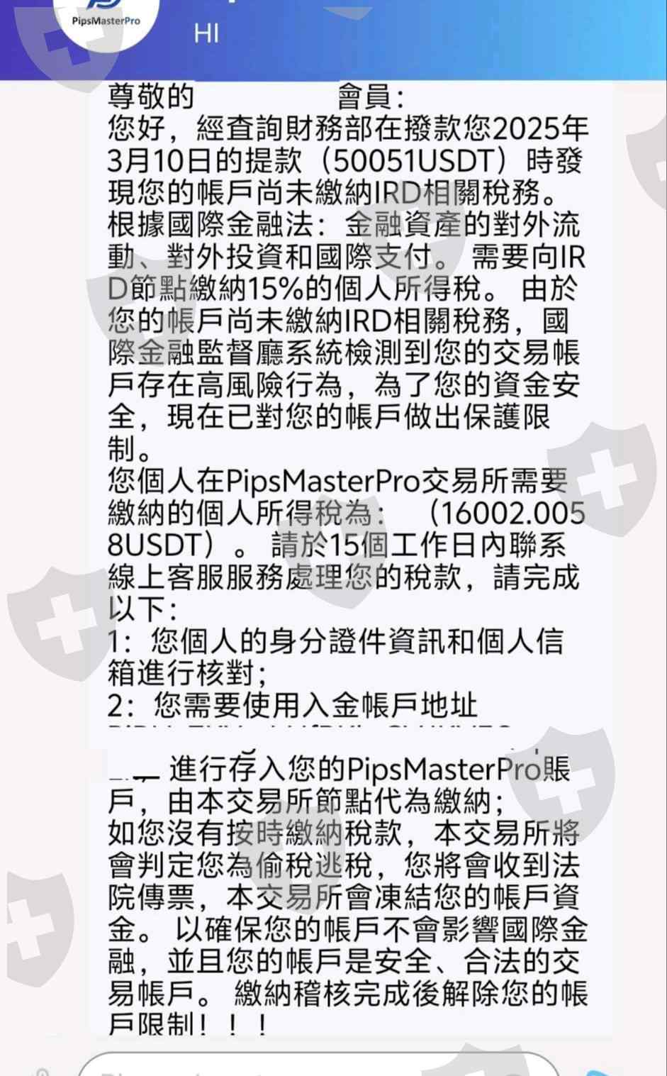 3個多月前透過IG認識一個網友,剛開始也都只是閒話家常,後來就有跟我提到可以投資黃金,請我下載了這個pipsMasterPro平台,去年12月第一次存了680USDT進去交易,後來為了能有更多盈利於今年1月陸續又存入4533USDT,2月存入20047USDT,因網路上認識的那位網友說明帳戶本金多一點交易節點會比較穩定而且能有更多獲利,於是於3月我又存入1505USDT,而他自己幫我存入56000USDT作交易,因為從去年12月到今年3/9申請出金都是正常的,直到3/10網友說他需要用到幫我存入的那筆資金,請我協助出金,才發現需要繳納IRD相關稅務才能出金,因自己目前手邊全部的資金都投入pipsmaterpro 平台根本就沒有多餘的錢可以繳納,網友一直請我去貸款,但是我身上還有其他貸款尚未還清,不想再去借貸,也擔心自己被詐騙