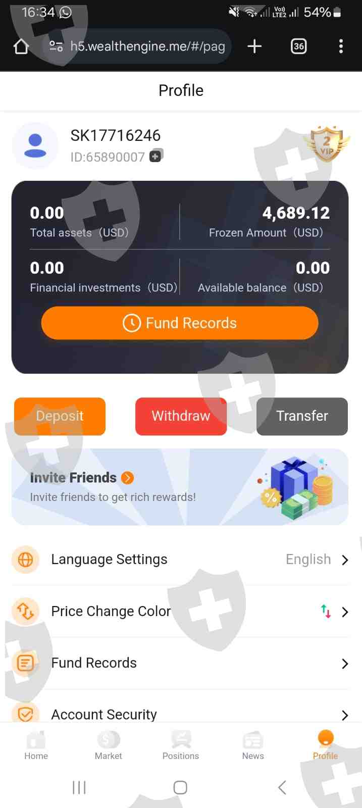 尊敬的先生/女士,我写信正式向交易平台提出投诉《 Wealthengine 》最近在未经事先通知或提供有效理由的情况下冻结了我的账户以及平台上所有其他交易者的账户。该平台现在要求支付100美元以解除冻结并允许我们使用资金。我坚信这一行为是非法的、不道德的,并且明显侵犯了交易者的权利。冻结用户账户并以支付额外费用为条件来获得访问权限是不可接受的,并引发了人们对该平台的合法性和对金融法规的遵守情况的严重担忧。我恭敬地请求您紧急介入调查此事,并采取必要措施保护投资者免受此类行为的侵害。感谢您的关注和迅速采取行动。我随时可以提供您可能需要的任何其他信息或证据。
