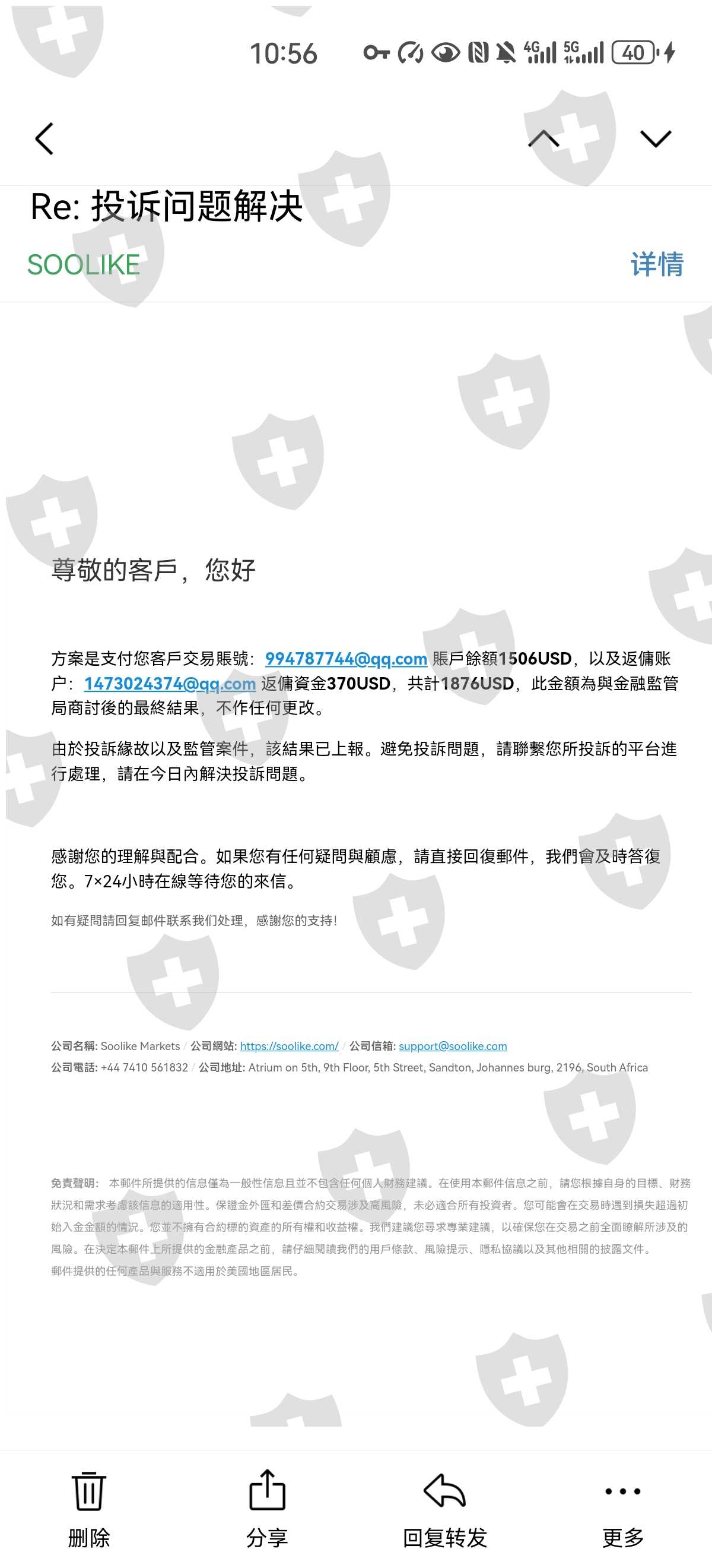 然后给我锁账户了,无法登陆。我联系监管平台投诉,客服回复说可以退还本金。但是要等。结果锁号期间我的账户里显示爆仓了!客服又说不给我退了。我追问他还说没锁过