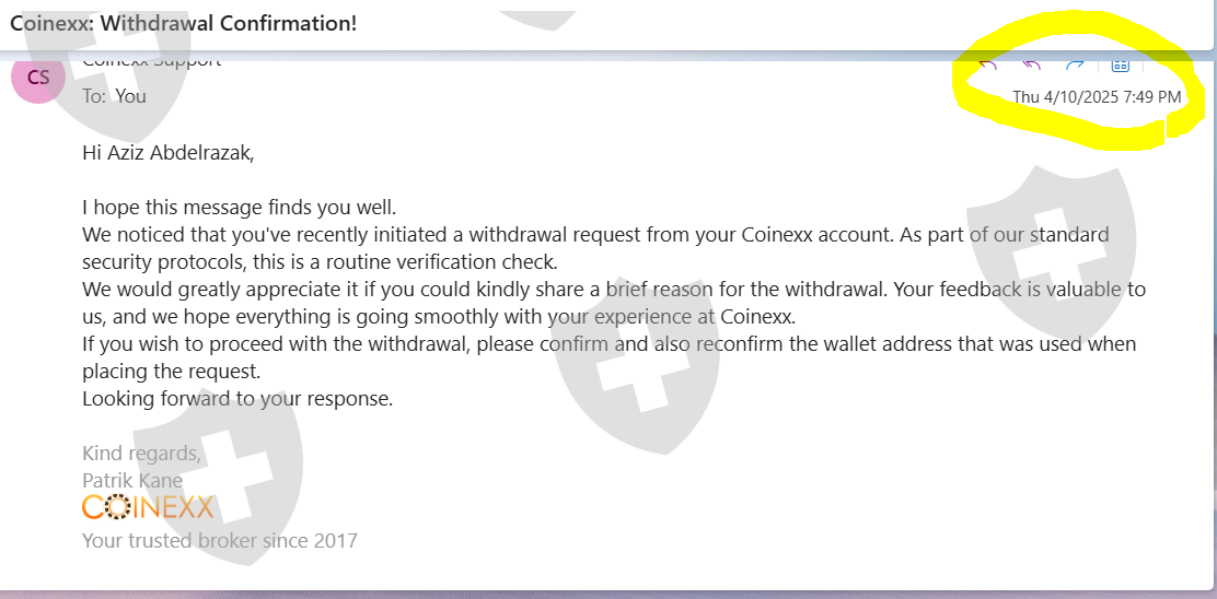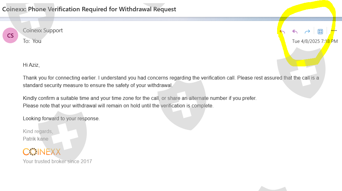 COINEXX我已经屏蔽了个人空间的访问权限。当我尝试连接我的MT5账户时,系统提示“账户无效”。事情发展得非常离谱。事情的起因是,我申请提取6000美元的利润。他们先是打电话联系我,要求我进行验证,之后再确认我的提款是否成功。第二天我联系他们,他们告诉我我的提款将在当天(周五)收市前到账。昨天我再次联系他们,询问提款事宜,他们告诉我会尽快处理。今天我才发现我的账户访问权限已被屏蔽。我通过聊天工具联系他们,他们告诉我账户被屏蔽是因为账户不活跃,或者说我昨天进行了交易是假的。然后他们又告诉我我的账户已被“回收”,稍后会通过电子邮件联系我。我发现自己无法完全查看我的存款账户。