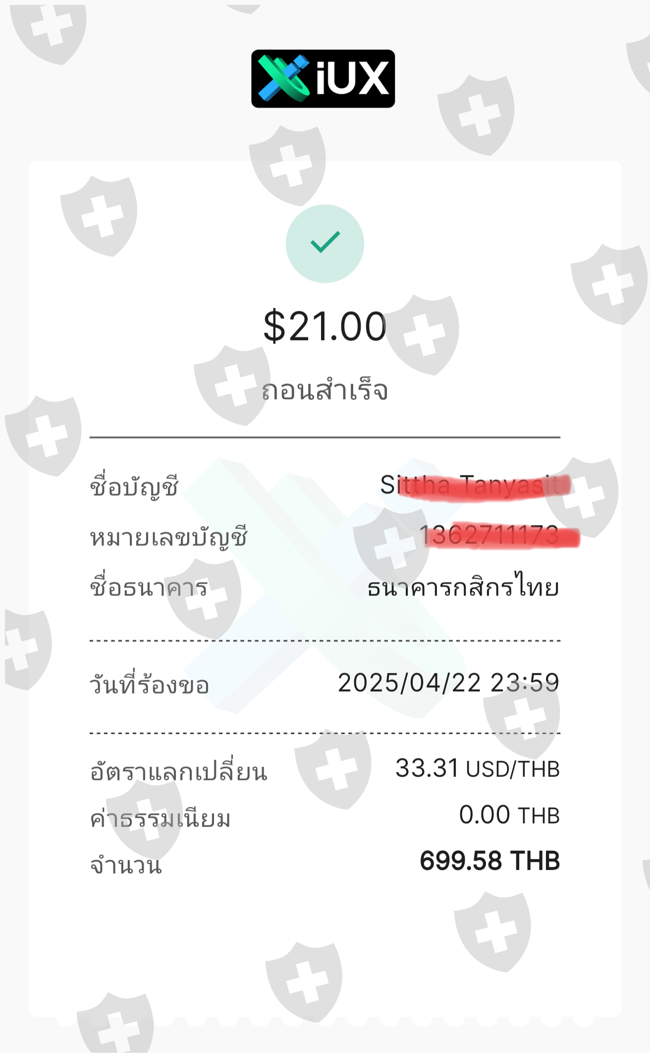 ผมถอนเงิน IUX แล้วยังไม่ได้เงิน ระบบบอกถอนเงินสำเร็จ แต่เงินไม่เข้าบัญชีแจ้งไป เค้าบอกให้รอ 24 ชั่วโมง ค่อยแจ้งใหม่ พอ 24 ชั่วโมงแจ้งไป บอกว่าส่งเรื่องไปสำนักงานใหญ่ให้ในรอตอบกลับ🌀
