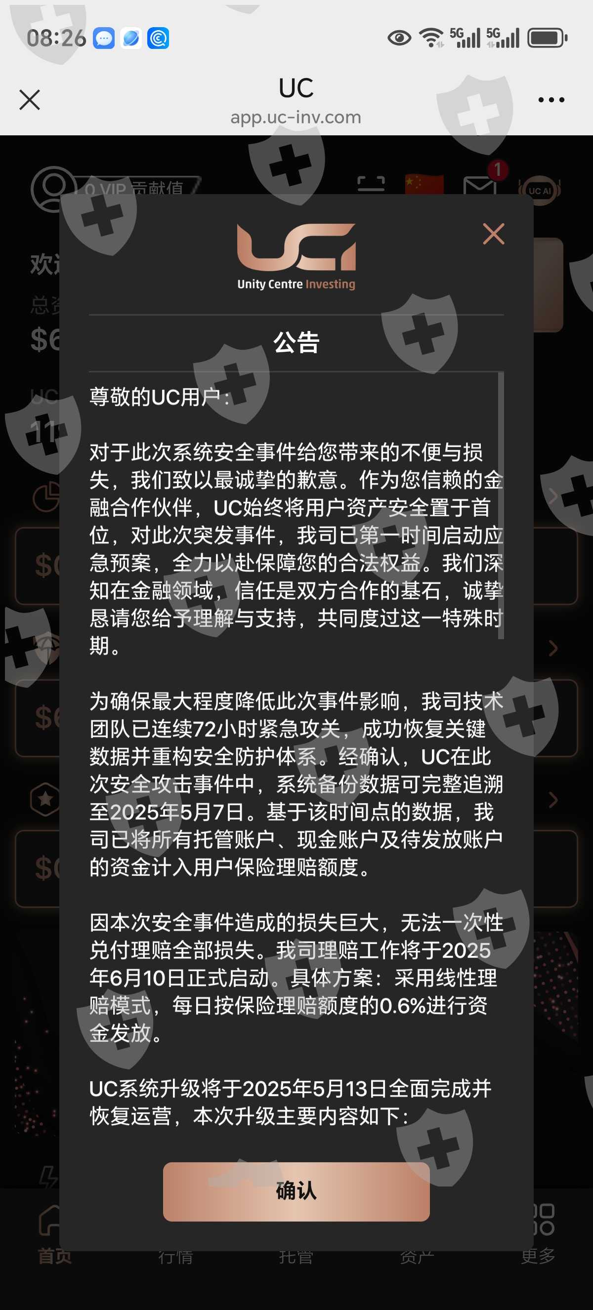 之前各种促销活动大规模吸金,特别是大额资金,5月9日出公告说是遭受安全攻击导致持仓订单无法按策略执行导致爆仓,5月11号又出公告说是公司很负责任,从6月10号起按照日0.6%线性赔偿客户,典型的诈骗公司,事实上是为了防止客户大面积报警软跑路,建议投资2万美金以上的赶紧报警挽回损失,一旦骗子将资金转移境外大家就真正的血本无归了